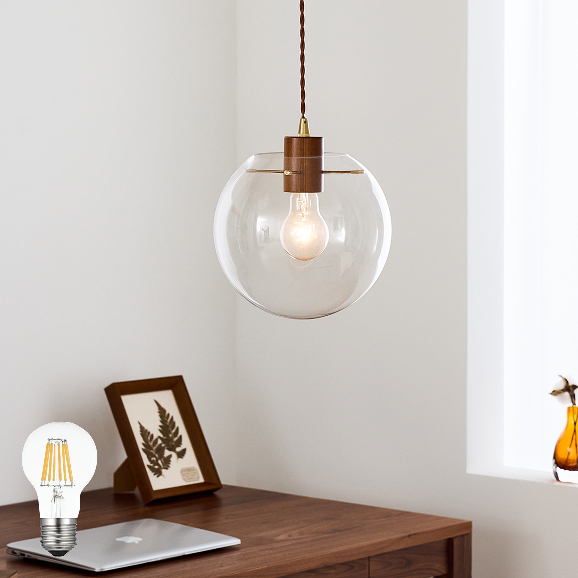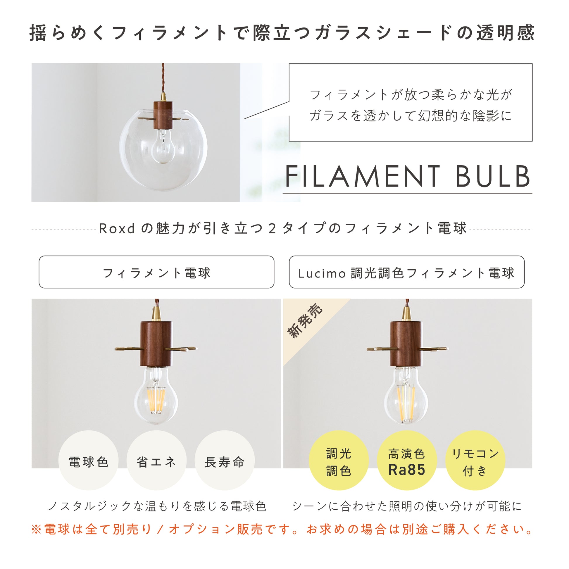 澄んだガラスシェードの美しさを生かすなら、フィラメント電球との組み合わせがおすすめ。繊細なフィラメントの光がゆっくりと広がり、洗練された奥行きのある空間を演出します。従来の当店オリジナルのフィラメントLED電球(VA60-CY-8W-E26)は、温かみある電球色のノスタルジックな灯りに。新発売の調光調色機能付きのタイプ(LUC-FL6G60)なら、時間帯や気分に合わせて光の表情を自在に整えられます。※電球はいずれも別売り/オプション販売です。
