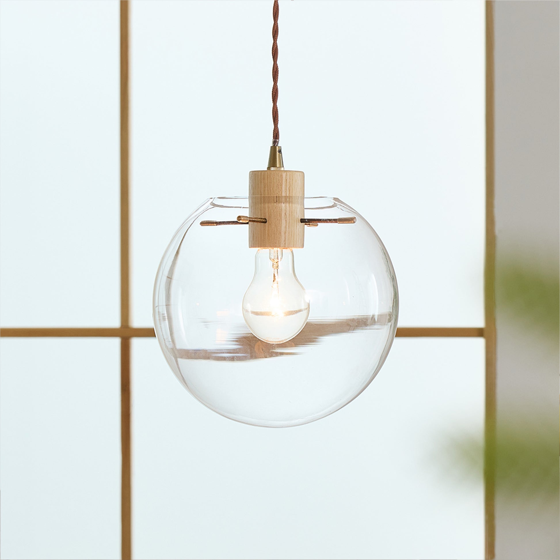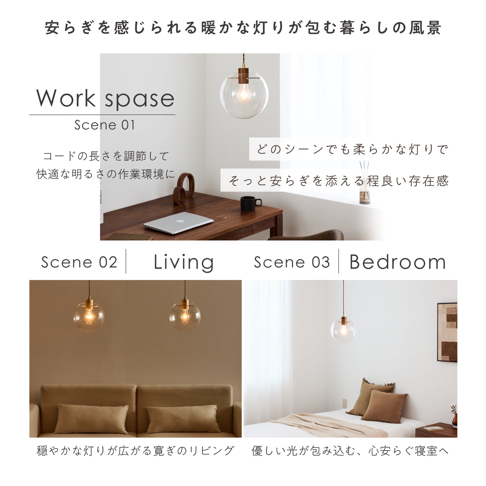 リビングやダイニング、寝室など、様々なシーンに溶け込む程良い存在感。温もりある天然木素材と澄んだガラスが生む柔らかな灯りが、日々の風景に静かな安らぎを添えてくれます。単体での使用はもちろん、多灯使用もインテリアに動きが出ておすすめ◎どのシーンでも空間を豊かに演出しながら、さりげなく彩ります。