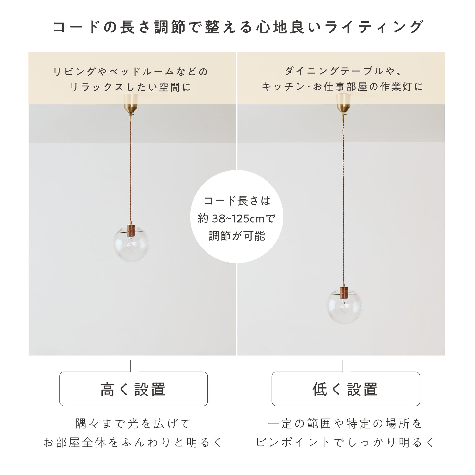 38〜125cmの高さ調整で、光の表情を自在にコントロールできます。ダイニングやキッチンカウンターでは低めに下げて手元を柔らかく照らしたり、ワークスペースの作業灯としても最適。リビングや寝室では高めに設置することで、光がふんわりと広がるリラックスした空間に。それぞれのシーンに寄り添いながら、お部屋の空気を静かに整えてくれる照明です。