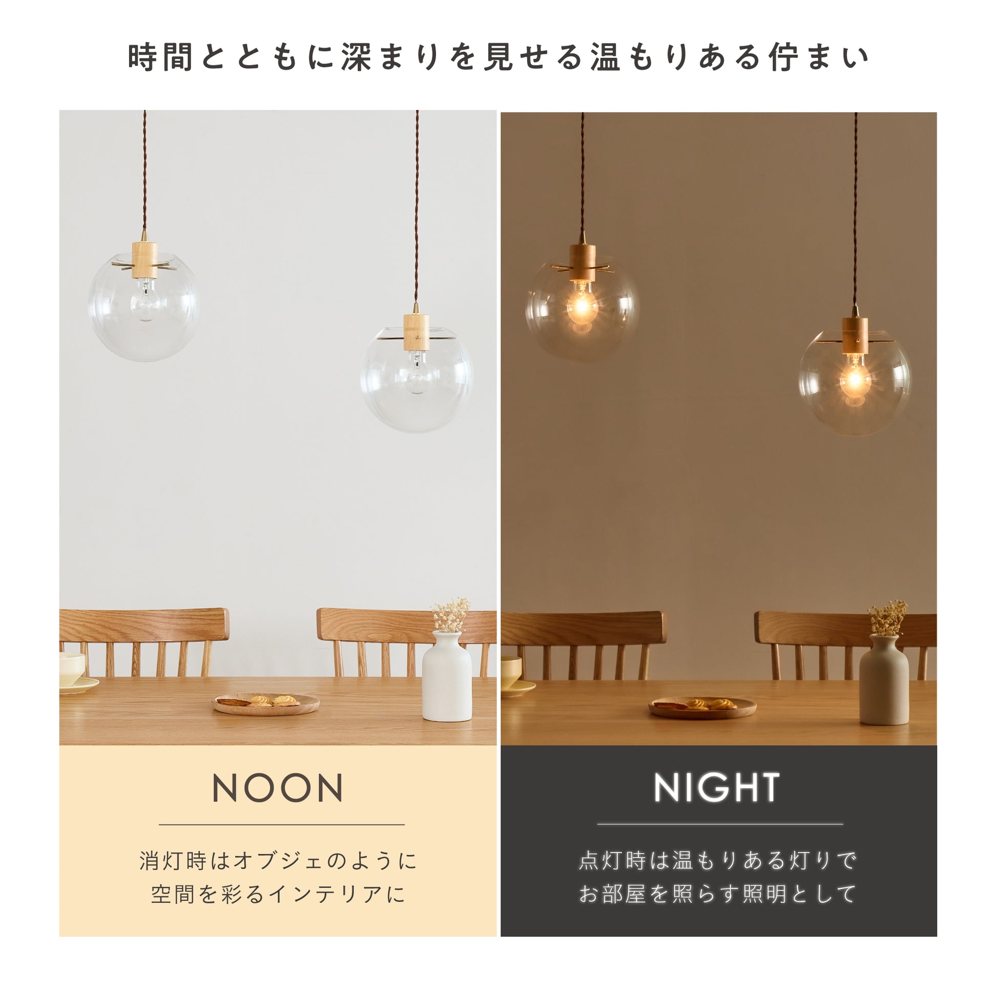 日中は自然光を受けて、ガラスの透明感とアッシュ材の穏やかな木目がやわらかく浮かび上がり、空間に心地よい温もりを添えます。夜は灯りがガラスの中でほのかに広がり、移りゆく時間とともに穏やかな表情を演出。点灯・消灯のどちらでも素材の魅力が引き立ち、暮らしに寄り添う優しいアクセントになります。