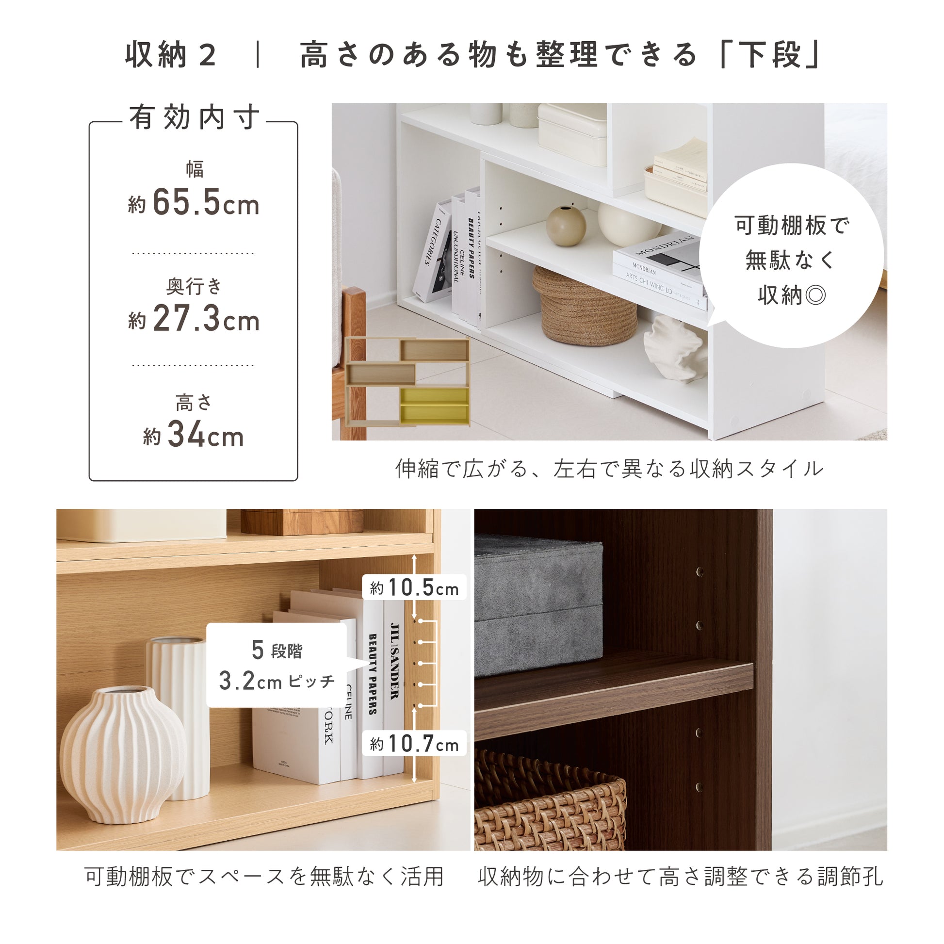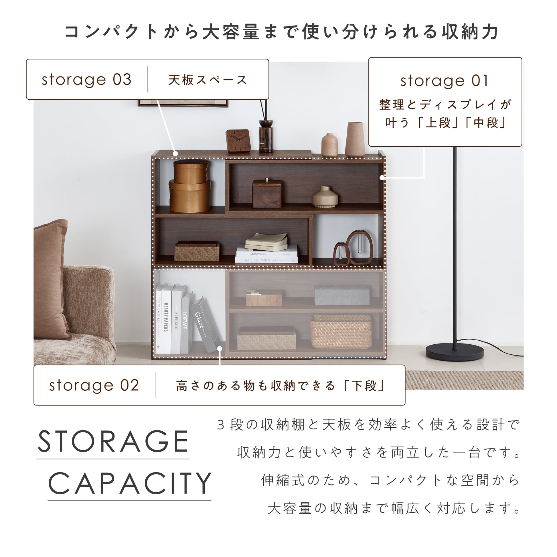 3段の収納棚と天板、それぞれのスペースを効率よく使える設計で、収納力と使いやすさを両立。上段・中段の収納はお気に入りのアイテムを引き立てるディスプレイに最適。下段の収納は高さのあるアイテムもすっきりまとめられます。さらに、天板は伸縮できるため、物や空間に合わせて調整でき、ちょっとした作業台としても活用できます。コンパクトな空間から大容量の収納まで、あらゆるシーンで便利に使えます。