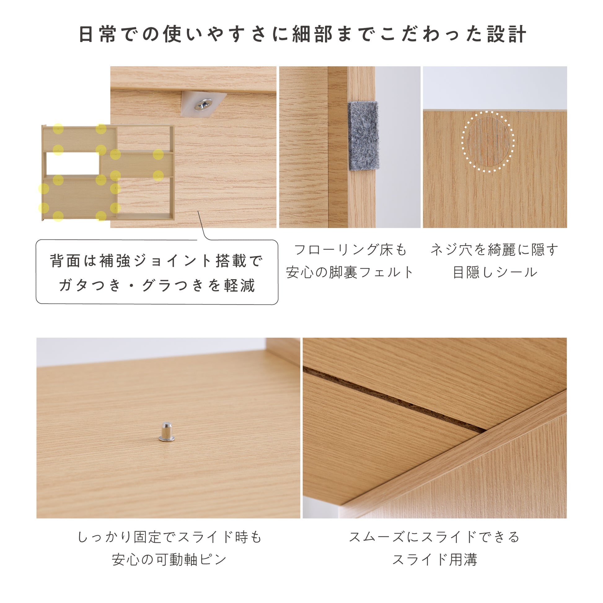 横揺れを抑える補強ジョイントやフローリングでも安心の脚裏フェルト、ネジ穴を目立たなくする目隠しシールなど、細部にまで配慮した丁寧な設計です。スライド用溝や可動軸ピンで、引き出しもスムーズに操作でき、使いやすさと安心感を両立しています。