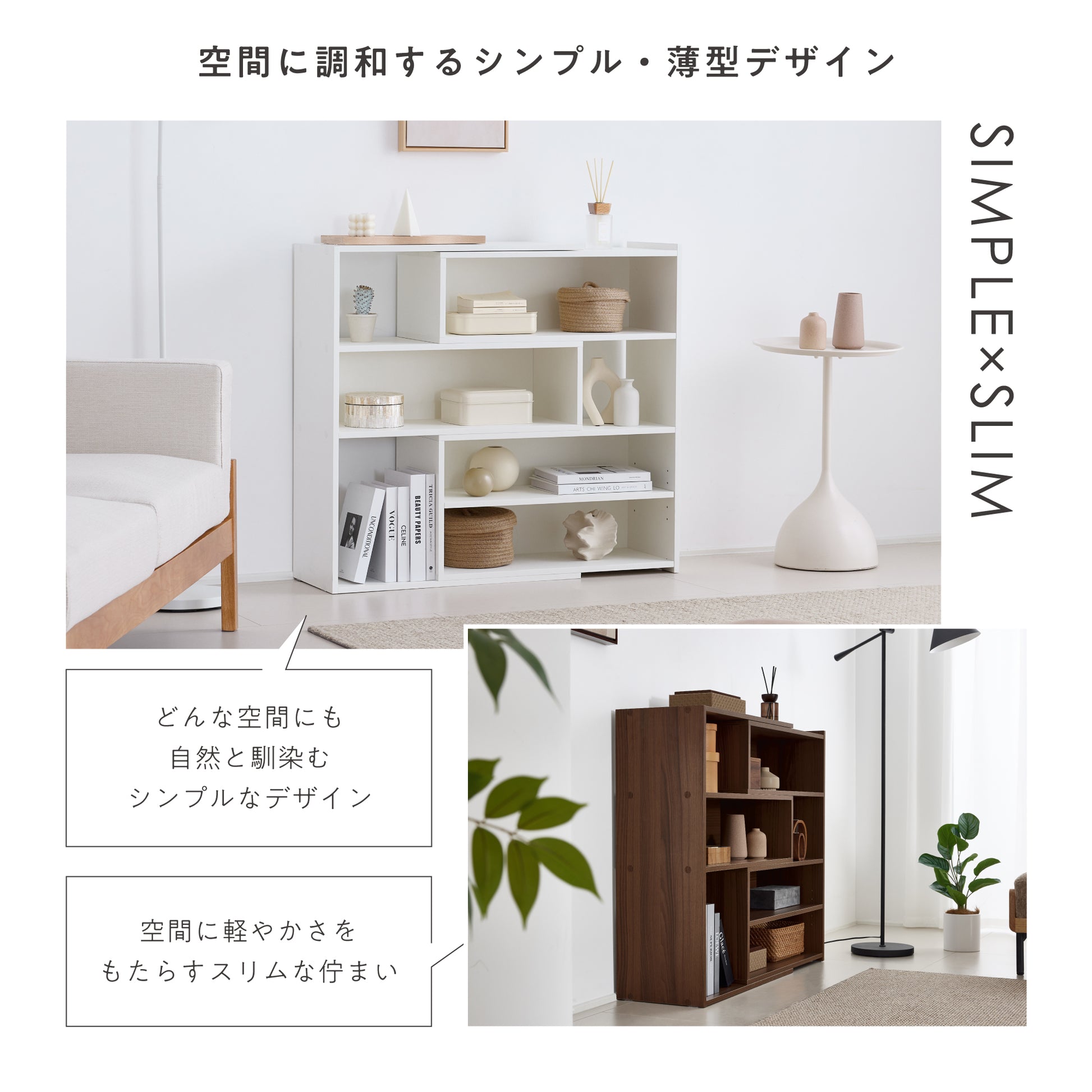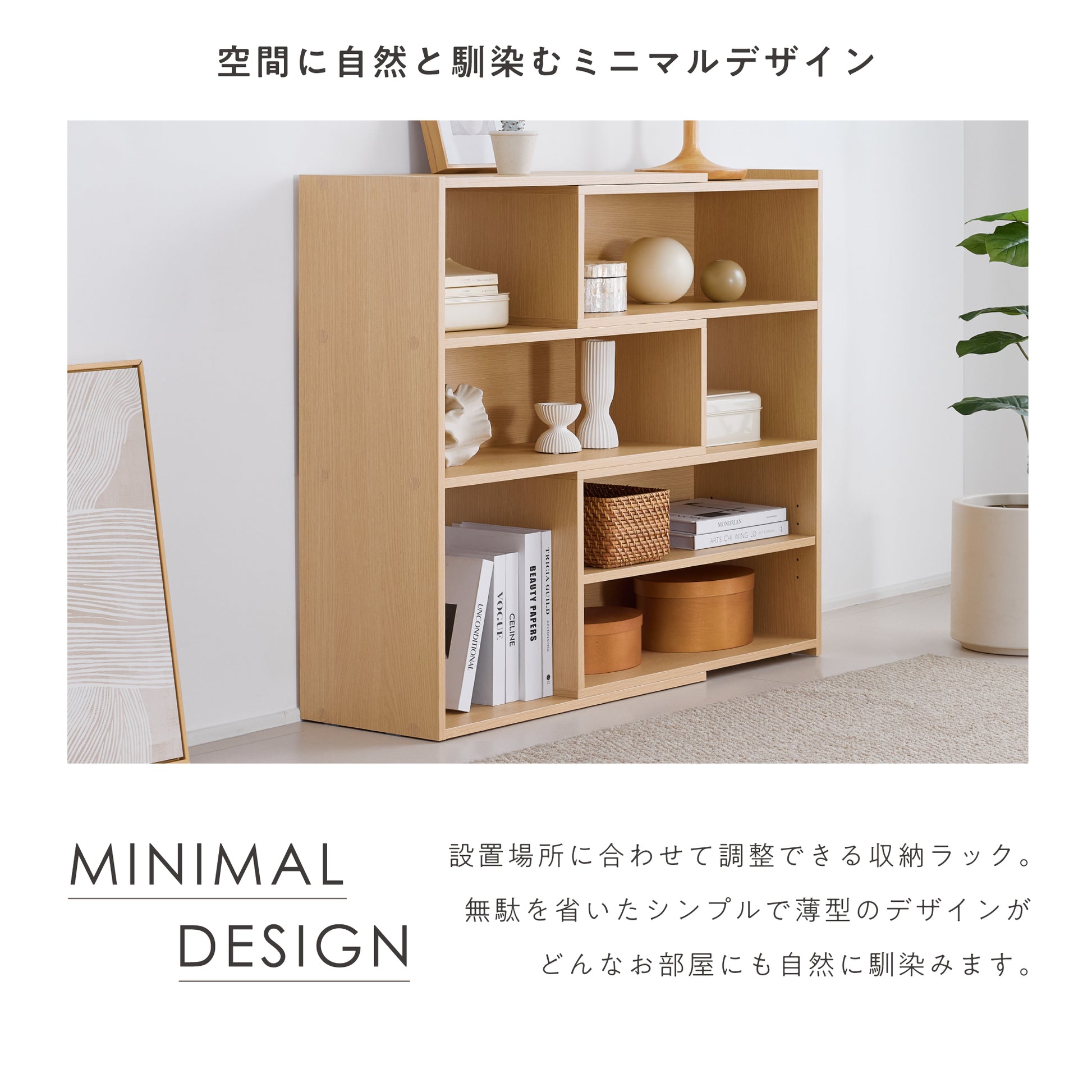 コンパクトから大容量まで、設置場所や使い方に合わせて自由に調整できる収納ラックです。シンプルで薄型のデザインはお部屋の雰囲気に自然に溶け込み、リビングや書斎などさまざまな空間に馴染みます。さらに、木目調の仕上げがあたたかみと上質さを加え、空間に豊かな表情をもたらします。デッドスペースも無駄なく活用できるなど、整理された印象と効率的な収納力を両立しています。
