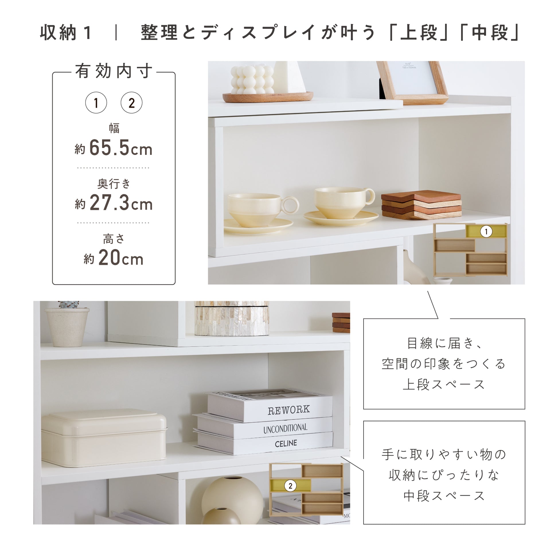 目線の高さにある上段・中段の収納は、ディスプレイスペースとして活用しやすい仕上がりに。お気に入りの雑貨や小物、書籍などを飾ることで、空間に自然なアクセントを添え、収納しながらインテリアを楽しめるスペースとして活躍。また、収納アイテムを変えることで季節や気分に合わせた演出も楽しめます。