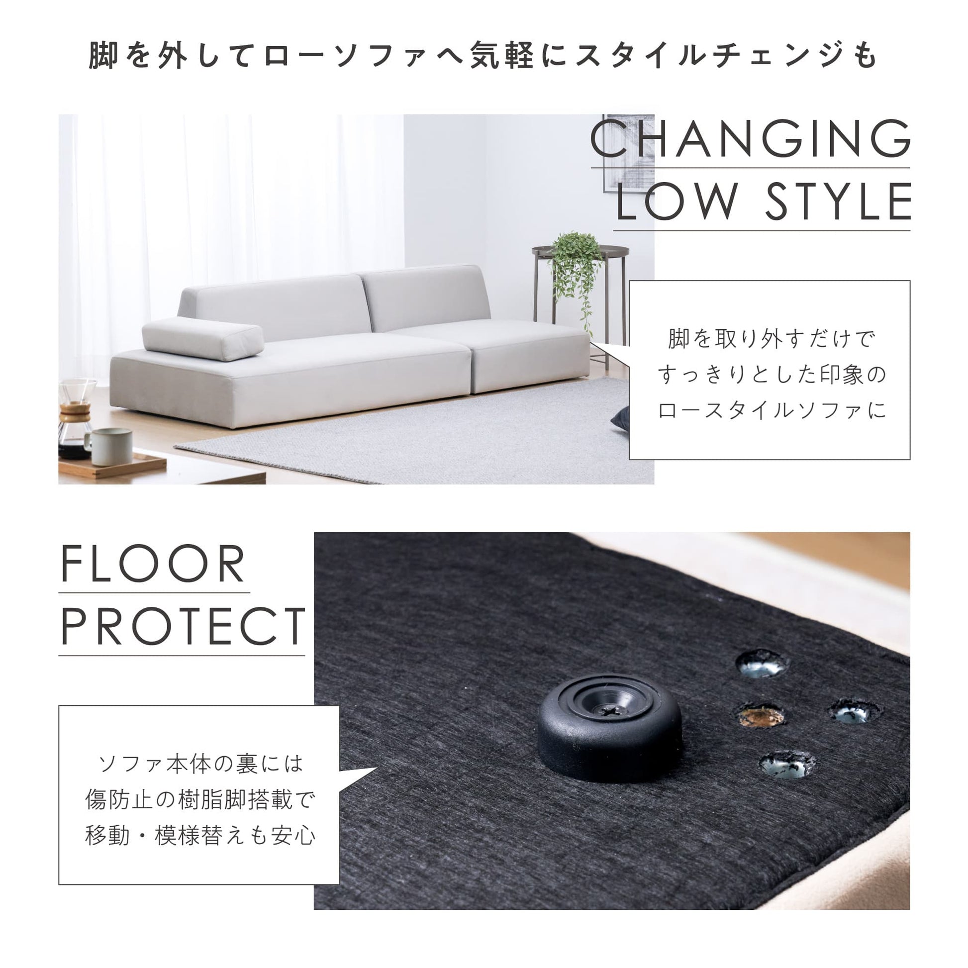 脚を外せば開放感のあるローソファとしても使用可能で、どんなお部屋にもフィットします。ロースタイルは、お部屋がすっきりとした印象になり、リラックスした雰囲気で、快適な座り心地を提供します。