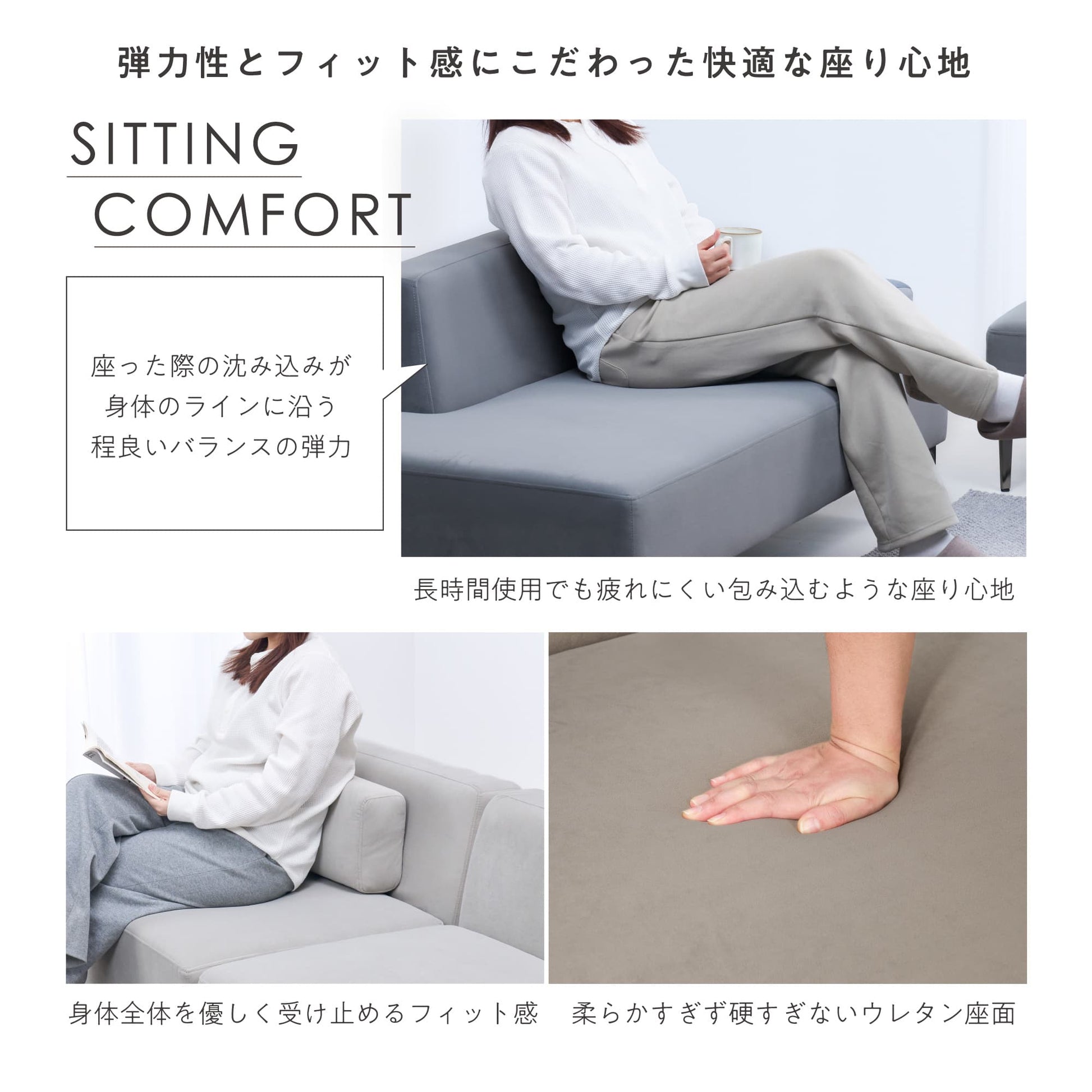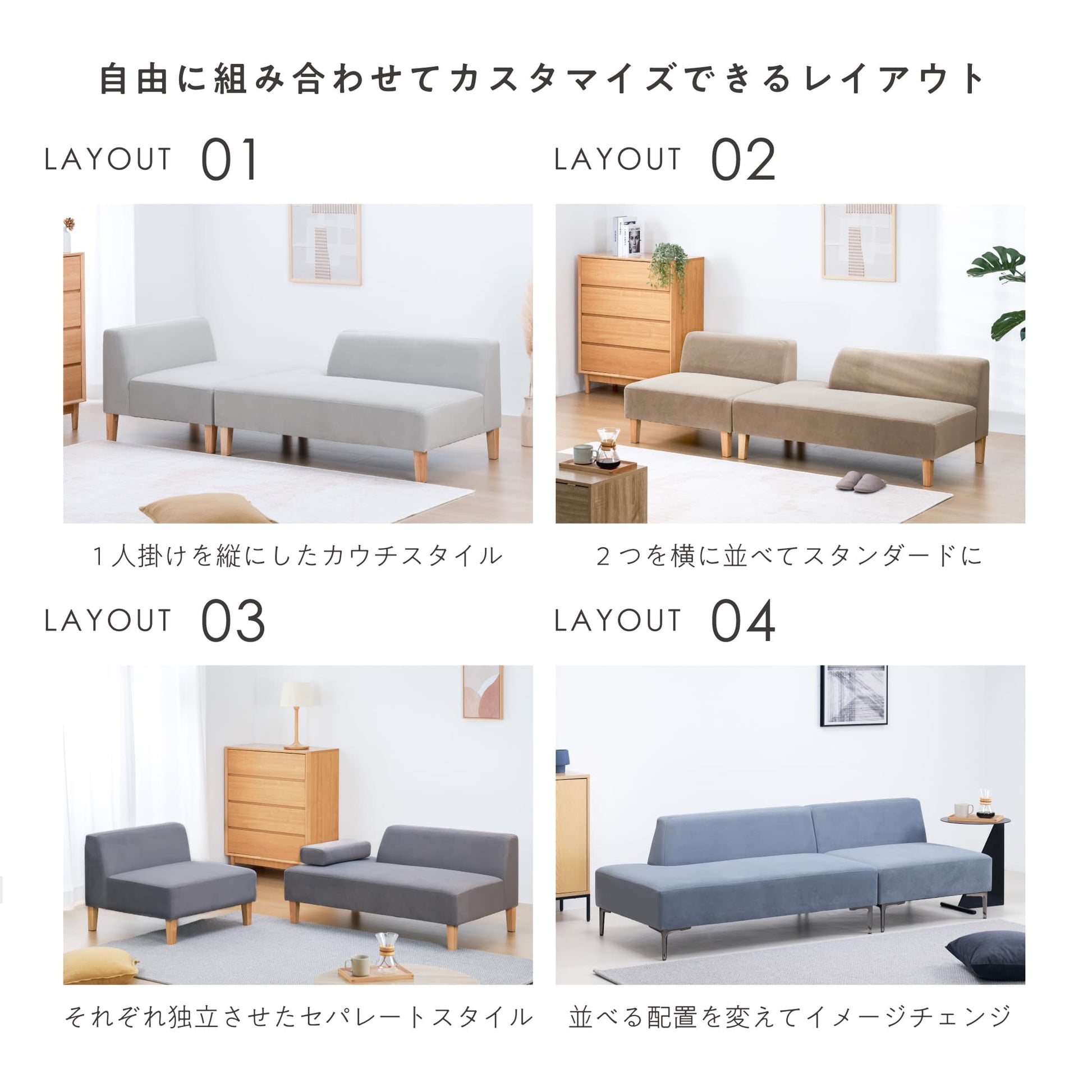 1人掛けソファを肘掛けとして使ったり、2つのソファを並べてセパレートタイプにしたりと、レイアウトの自由度が高いです。お部屋のスペースや用途に合わせて、自在にアレンジできます。