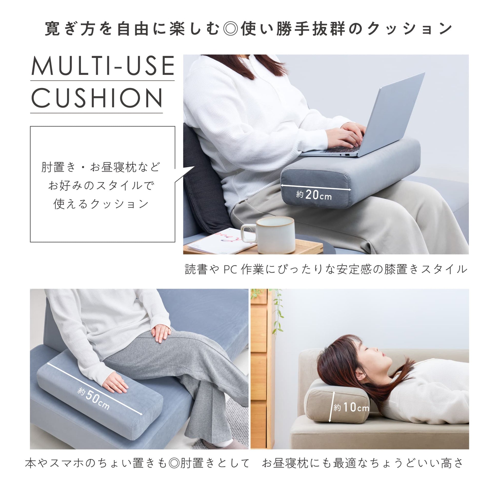 クッションは移動可能で、肘掛けやお昼寝の枕としても使える便利さが魅力です。膝の上に置いて本を読むなど、様々なシーンで活躍します。