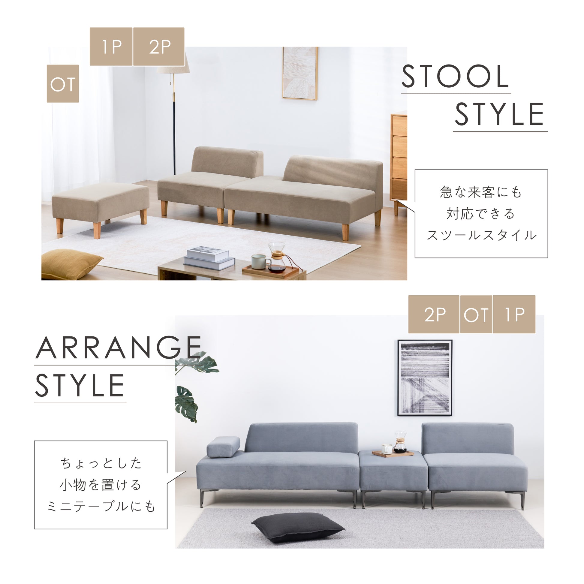 ソファとオットマンを組み合わせることで、カウチスタイルやスツールスタイルなど、自由自在なレイアウトが可能です。お部屋のスペースや用途に合わせて、自在にアレンジできるのが魅力です。