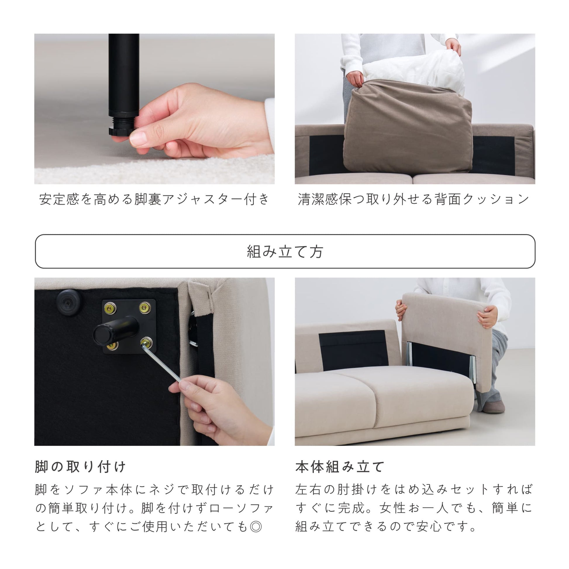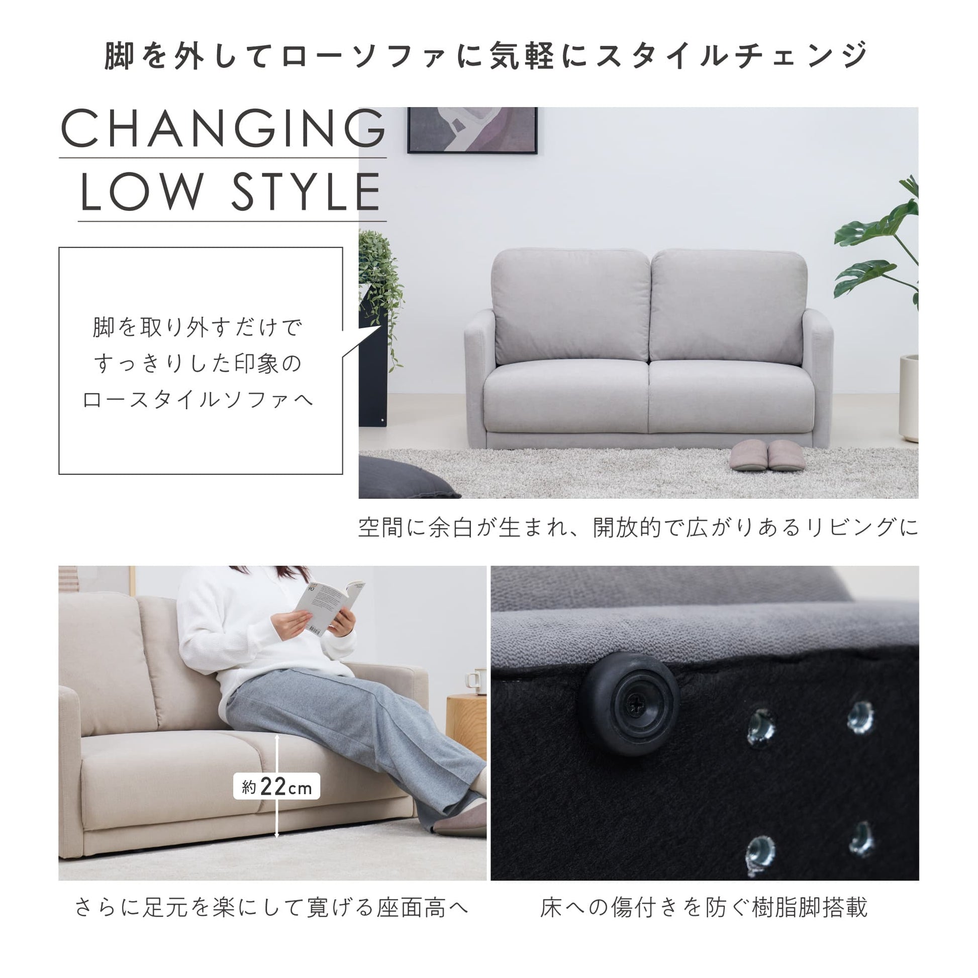 脚部を取り外せば、さらに座面の低いロータイプソファに早変わり。ロースタイルにすることで空間に脚を外すことでさらに足元を楽にできるローソファにも。お部屋の雰囲気や用途に合わせて、気軽にスタイルを変えられるのが魅力です。
