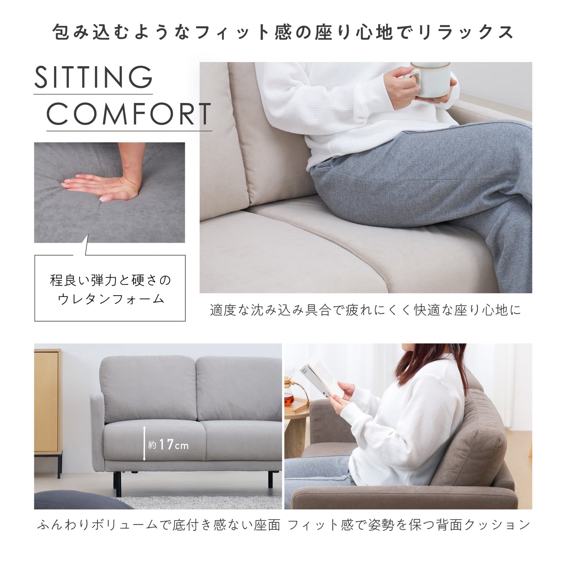 ふっくらとしたボリュームある座面クッションが、底付き感のない包み込むような座り心地に。しっかりとした背もたれが優しく背中にフィットし、楽に過ごせる姿勢をサポートします。長時間座っても疲れにくく、ソファでの時間をより心地良く、快適に過ごせます。