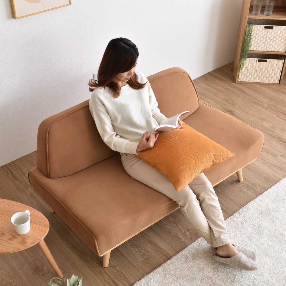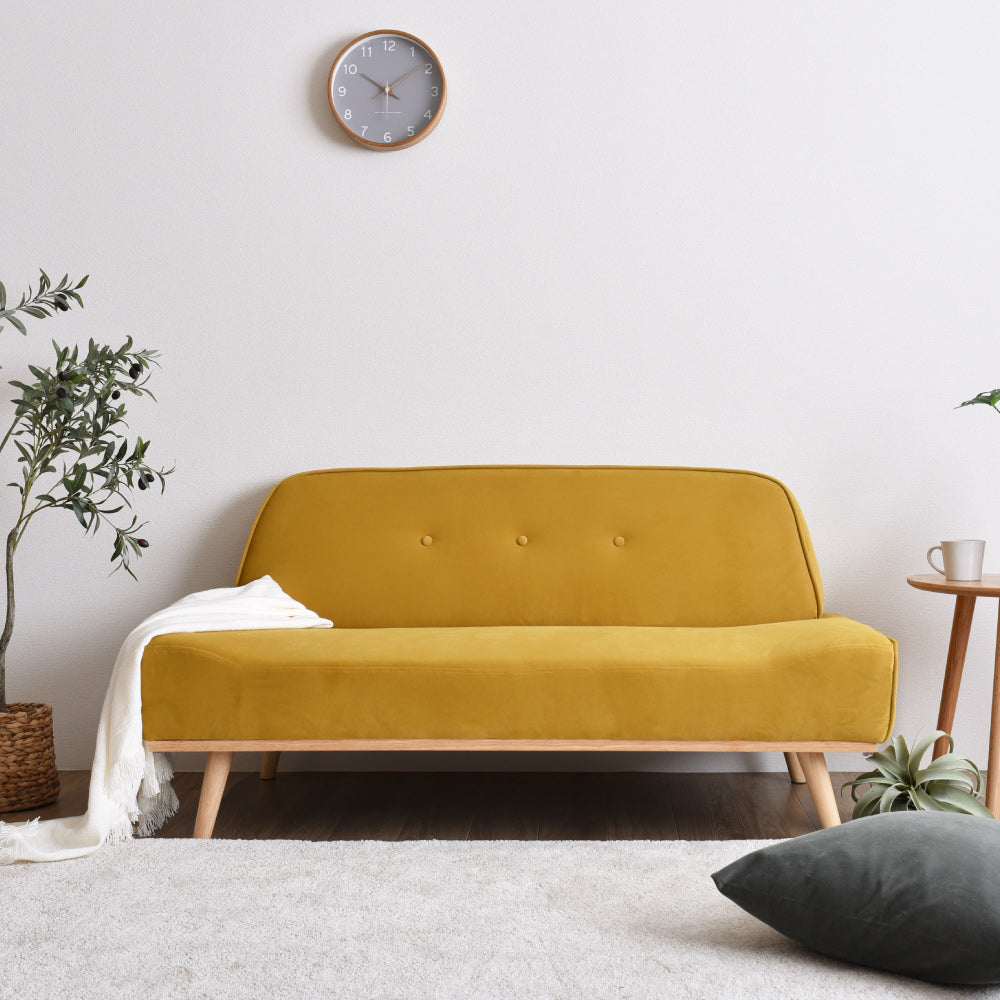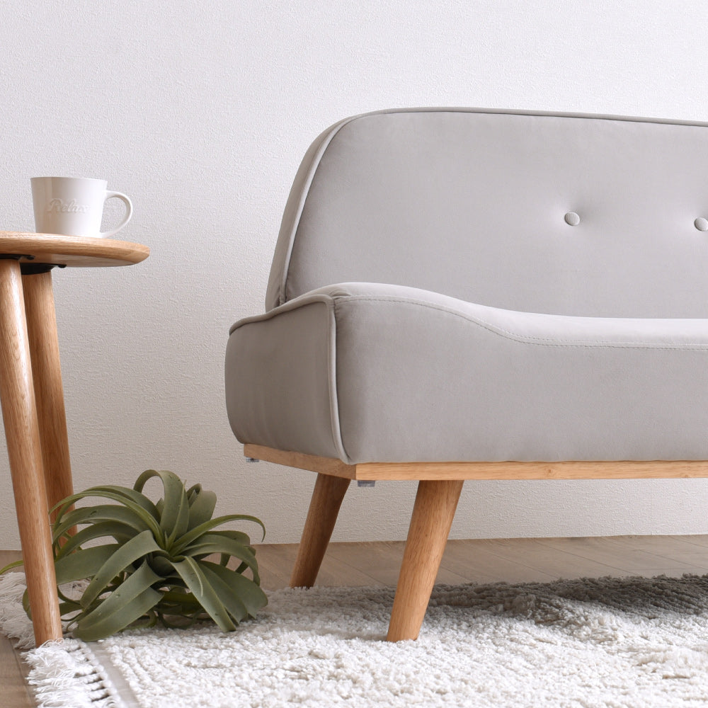 丸いフォルムが特徴のシンプル&ミニマルなデザインの2人掛けソファ『Cauto』。座面と背もたれにベロア調の生地を使用し、触った瞬間にしっとりと肌に馴染む質感でいつまでも触っていたくなるような柔らかさのソファです。ミニマル設計でもゆったりと余裕のあるサイズ感で、足を伸ばしてくつろいだり、大人2人が並んで座ることもできます。天然木の脚の組み合わせがアクセントとなりお部屋をより一層おしゃれに引き立てます。脚を取り外せば、低い位置でリラックスできるロータイプソファとしてもお使いいただけます。