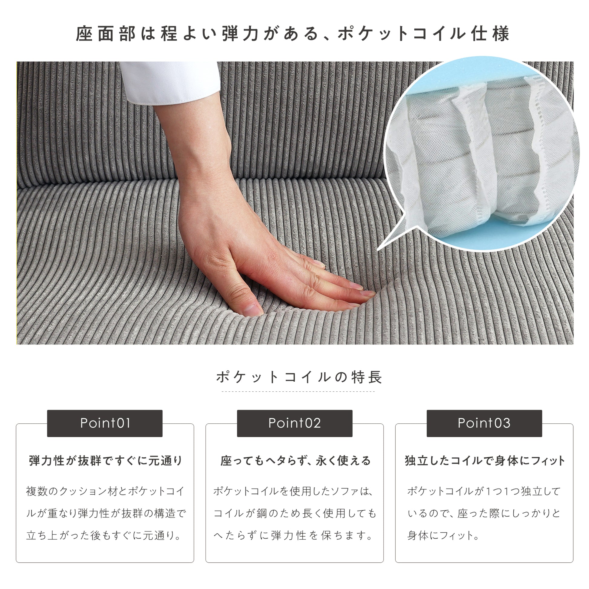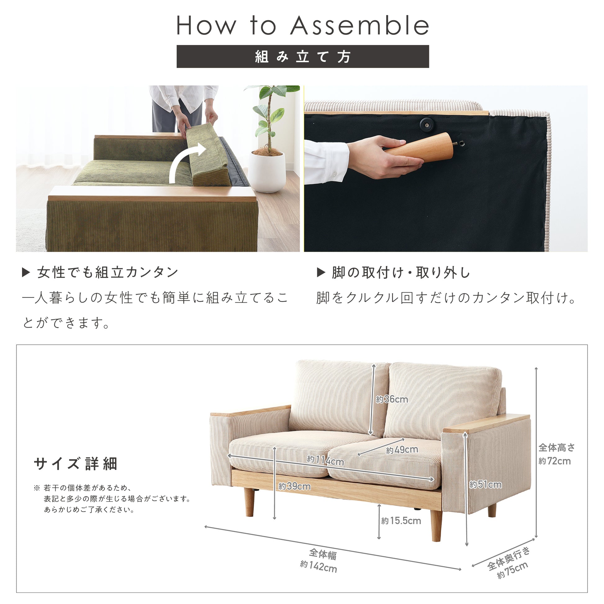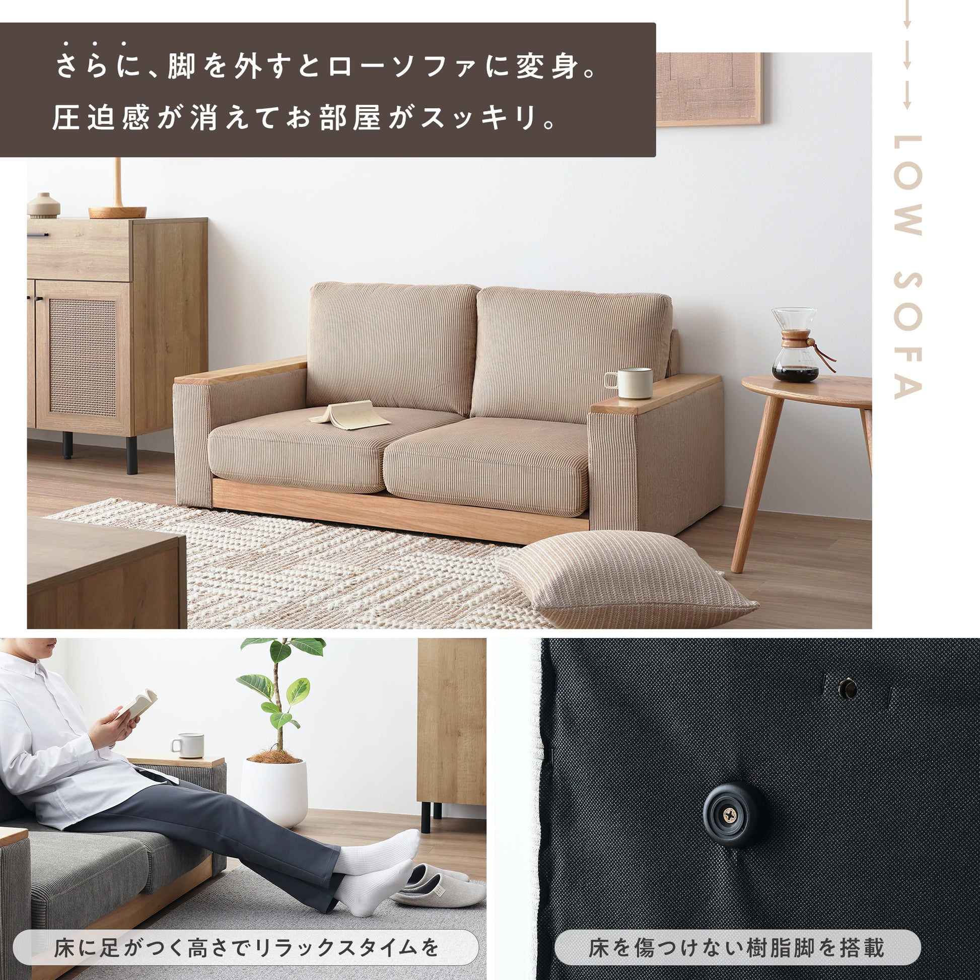 優しく包まれる心地良さに体を預けられる2人掛けソファCosna(コスナ)。深みのあるコーデュロイ生地と味わい深い天然木の素材感から、深い安らぎを得られます。ソファ本体にはポケットコイルを採用。固すぎず、柔らかすぎない座り心地は長時間座っても疲れにくく、充実のリラックスタイムが実現します。また、コンパクトながらゆとりあるサイズ感はお部屋を広く見せるロースタイルと相まって、圧迫感のない開放的な空間を演出します。脚を外せばローソファになり、使い方も自由自在です。組み立ても簡単で女性でも安心。安心の耐久性とお手入れの簡単さを兼ね備えた、長くご使用いただけるソファです。