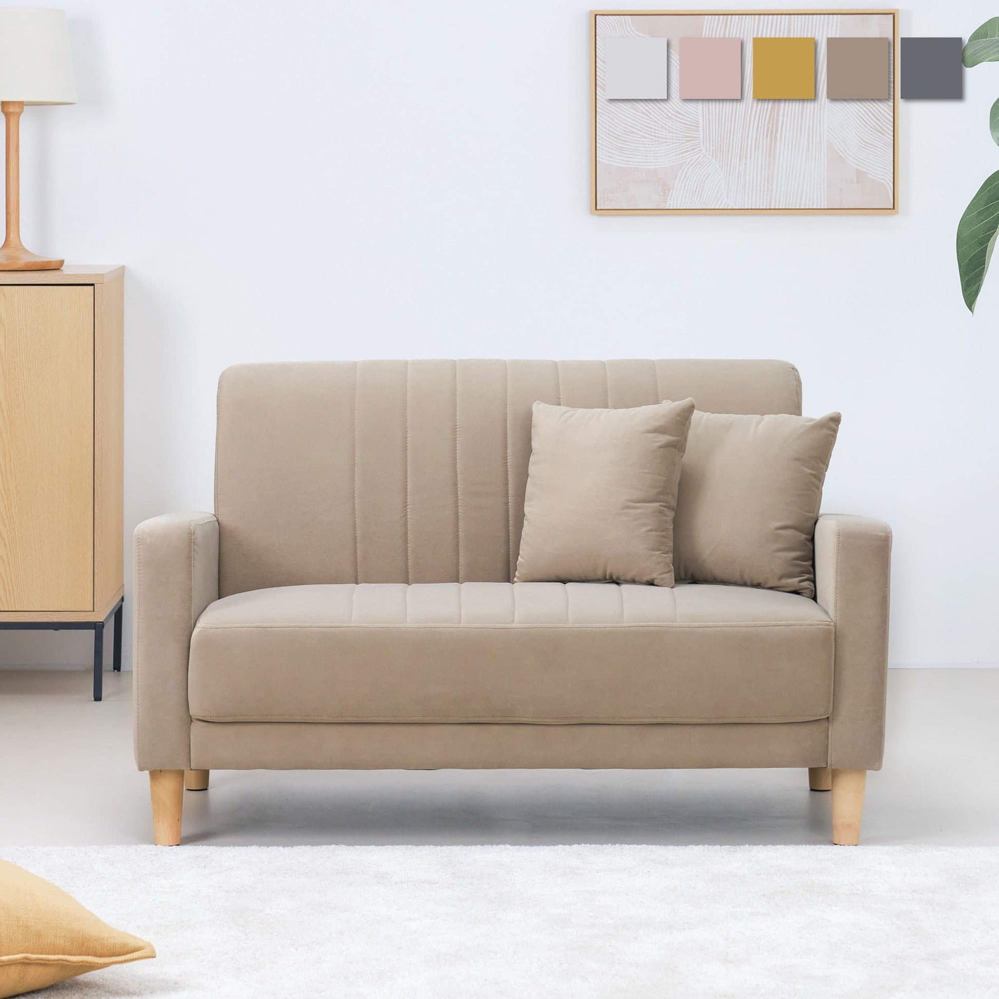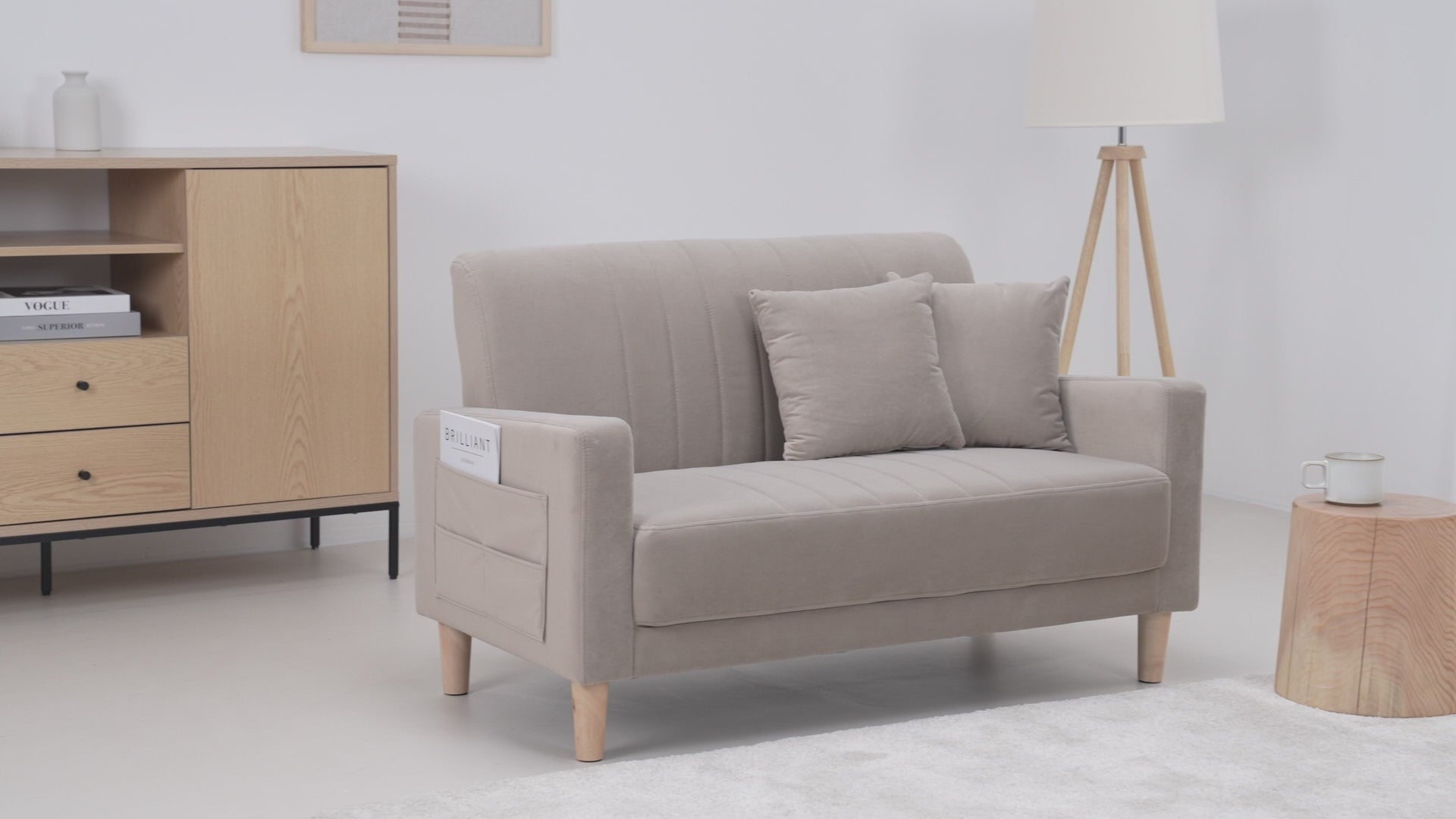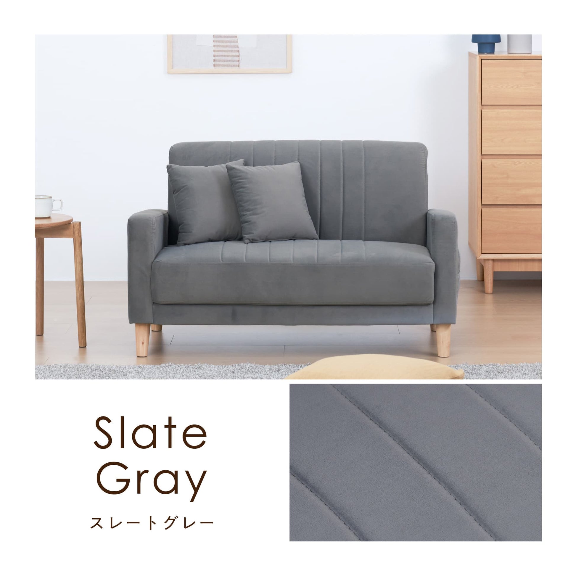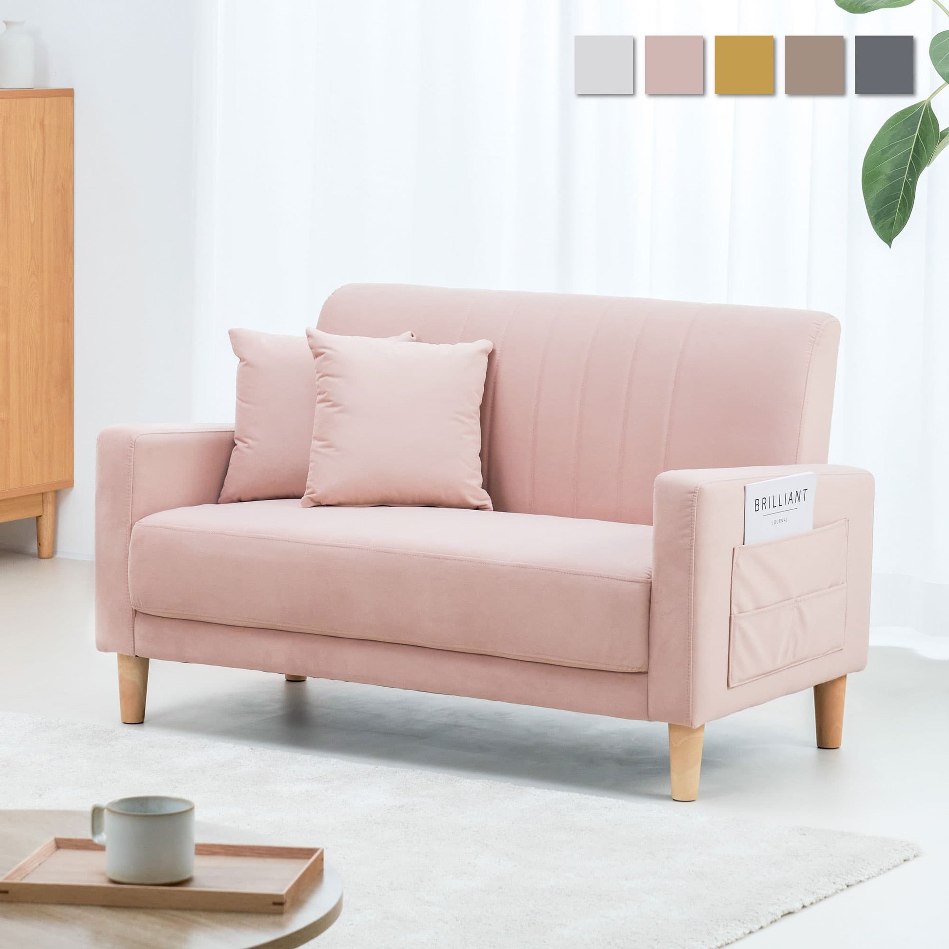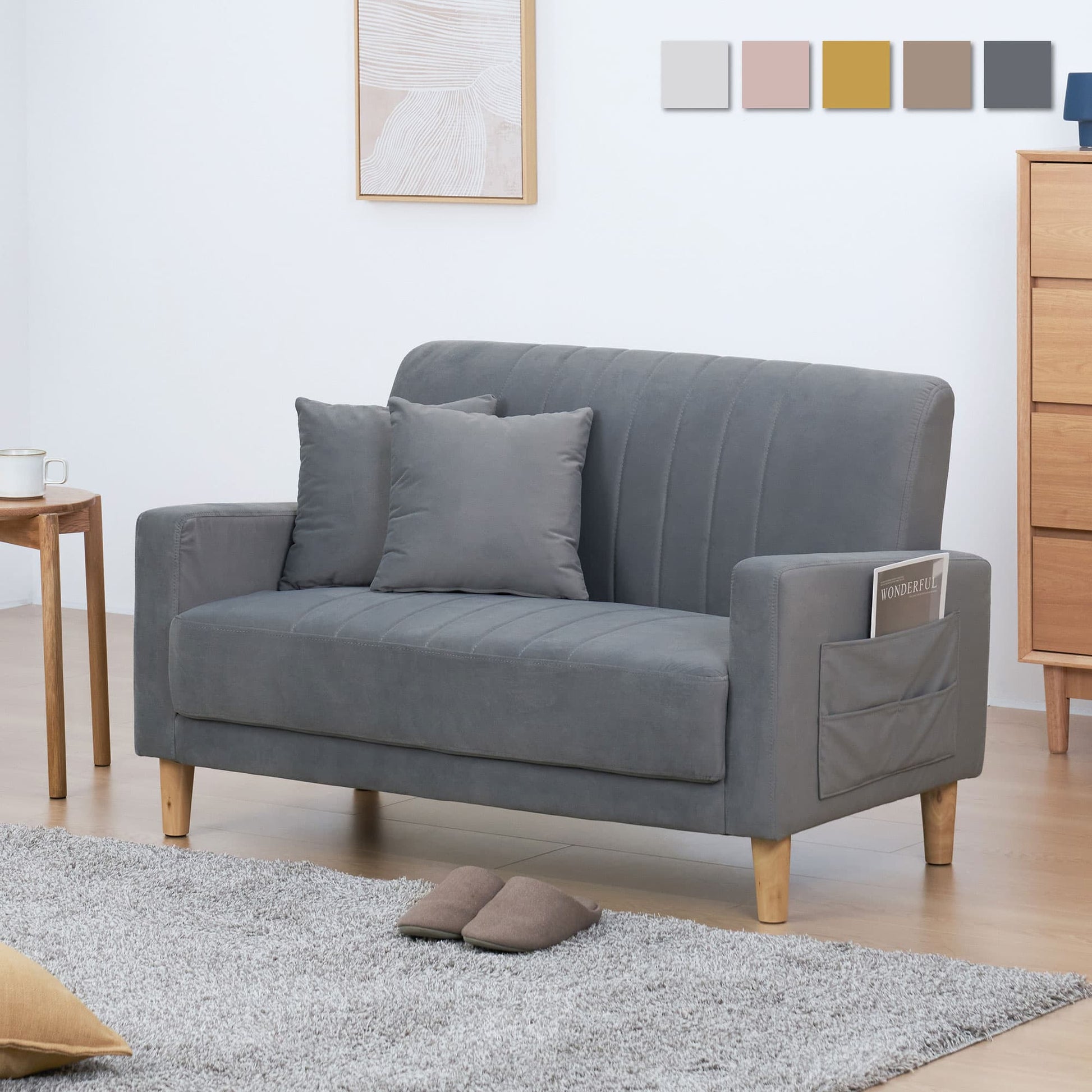 日常の中に特別なひとときをもたらす二人掛けソファ「Paco-N」。ベロア生地の柔らかな手触りと美しい光沢が、お部屋をシックな印象に仕上げます。コンパクトながらゆとりある座面は、快適なリラックス時間を実現。厚みのある背もたれはが長時間でも疲れにくい姿勢をサポート。天然木の脚がさらにインテリアに上質さをプラスします。脚を外して、ロースタイルソファにスタイルチェンジも。リモコンなどの手元に置いておきたい小物をすっきり収納できるサイドポケット付きです。耐荷重150kgの高い耐久性と、お一人でもできる簡単組み立ても嬉しいポイント。ラウンドフォルムとダスティカラーのベロアが、ラグジュアリー感漂う空間を演出します。