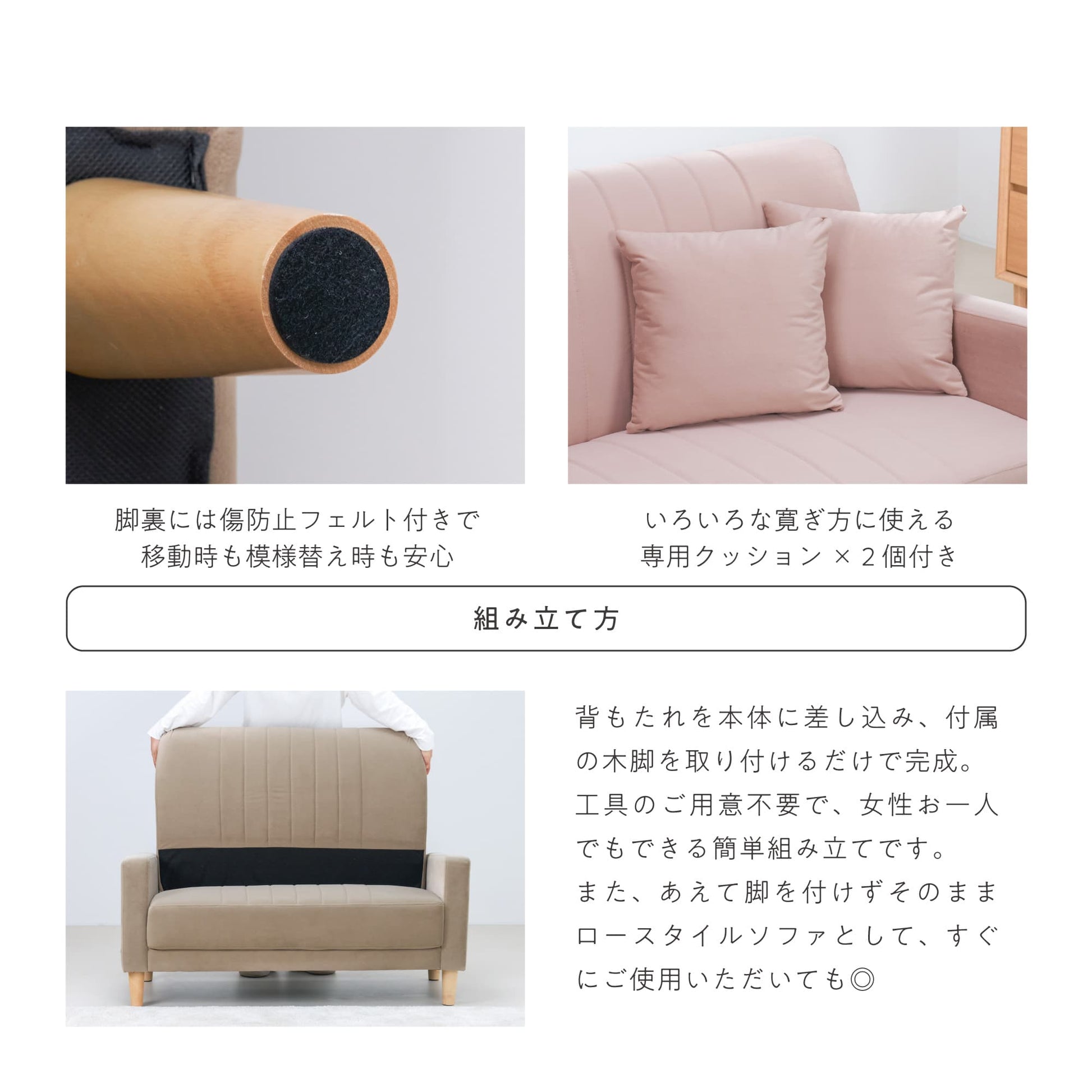 組み立てはソファ本体を背面に差し込んで、木脚を取り付けるだけで完成。工具をご用意いただく必要もありませんので、女性お一人でもできる簡単組み立てです。また、脚を付けずにそのままロースタイルソファとして、すぐにお使いいただくことも可能◎