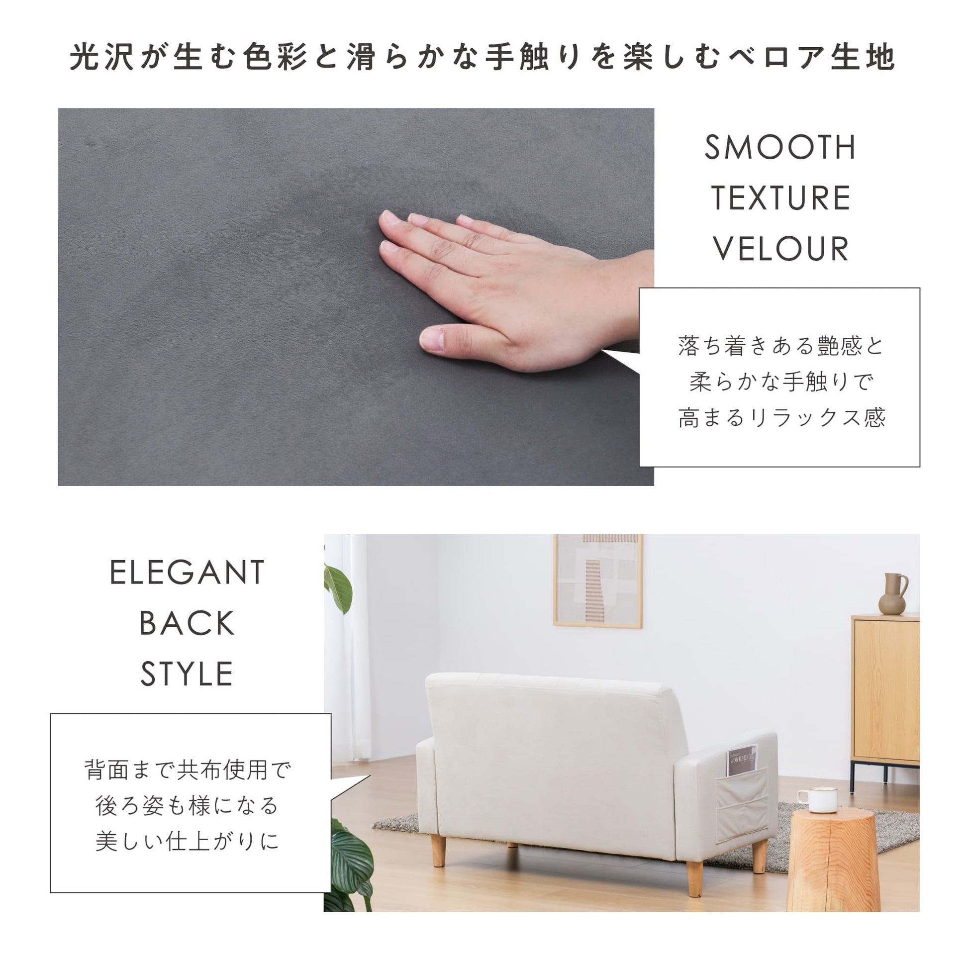 ベロア生地の起毛が光に反射して生まれる光沢が、お部屋にラグジュアリーな雰囲気をプラス。シックなダスティカラーがさりげないアクセントに。触れるたびに心地よさを感じられる手触りで、よりリラックス感が高まります。背面まで美しい仕上がりは、どの角度から見ても洗練された佇まいに。