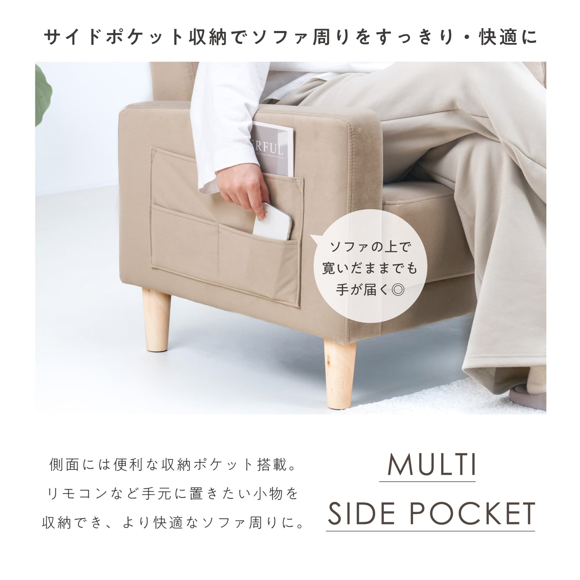 ソファで寛いだままでも手が届く収納ポケット