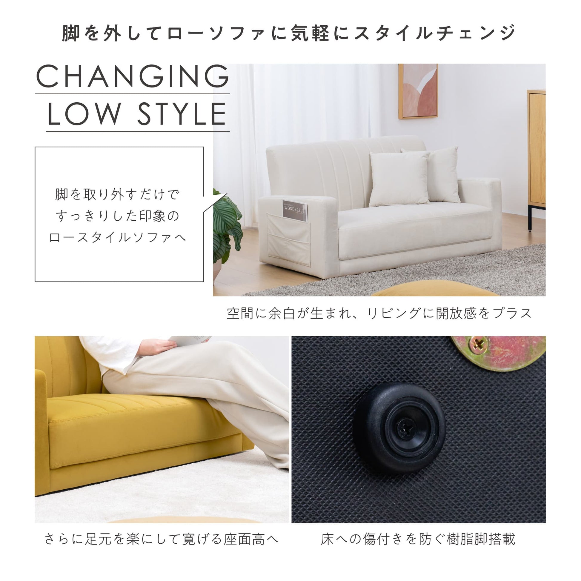 脚部を取り外せば、さらに座面の低いロータイプソファに早変わり。ロースタイルにすることで、足元がより楽になり、空間に広がりを与えます。お部屋の雰囲気や用途に合わせて、気軽にスタイルを変えられるのが魅力です。