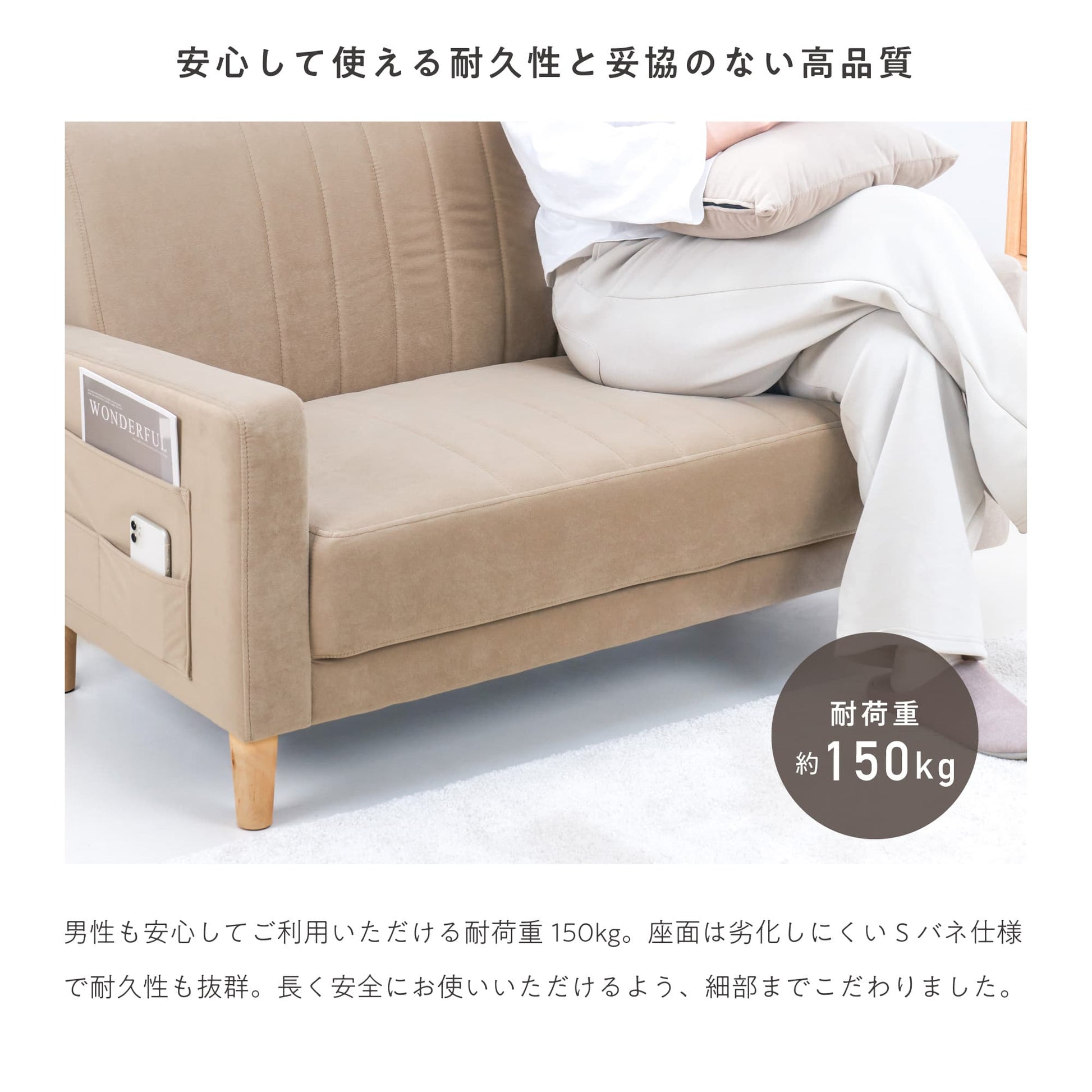 男性の方も安心してご使用いただける、約150kgの高耐荷重。 座面は劣化しにくく丈夫なSバネ仕様で耐久性も抜群です。毎日使うものだからこそ長く安全にお使いいただけるよう、品質面にもしっかりとこだわりました。