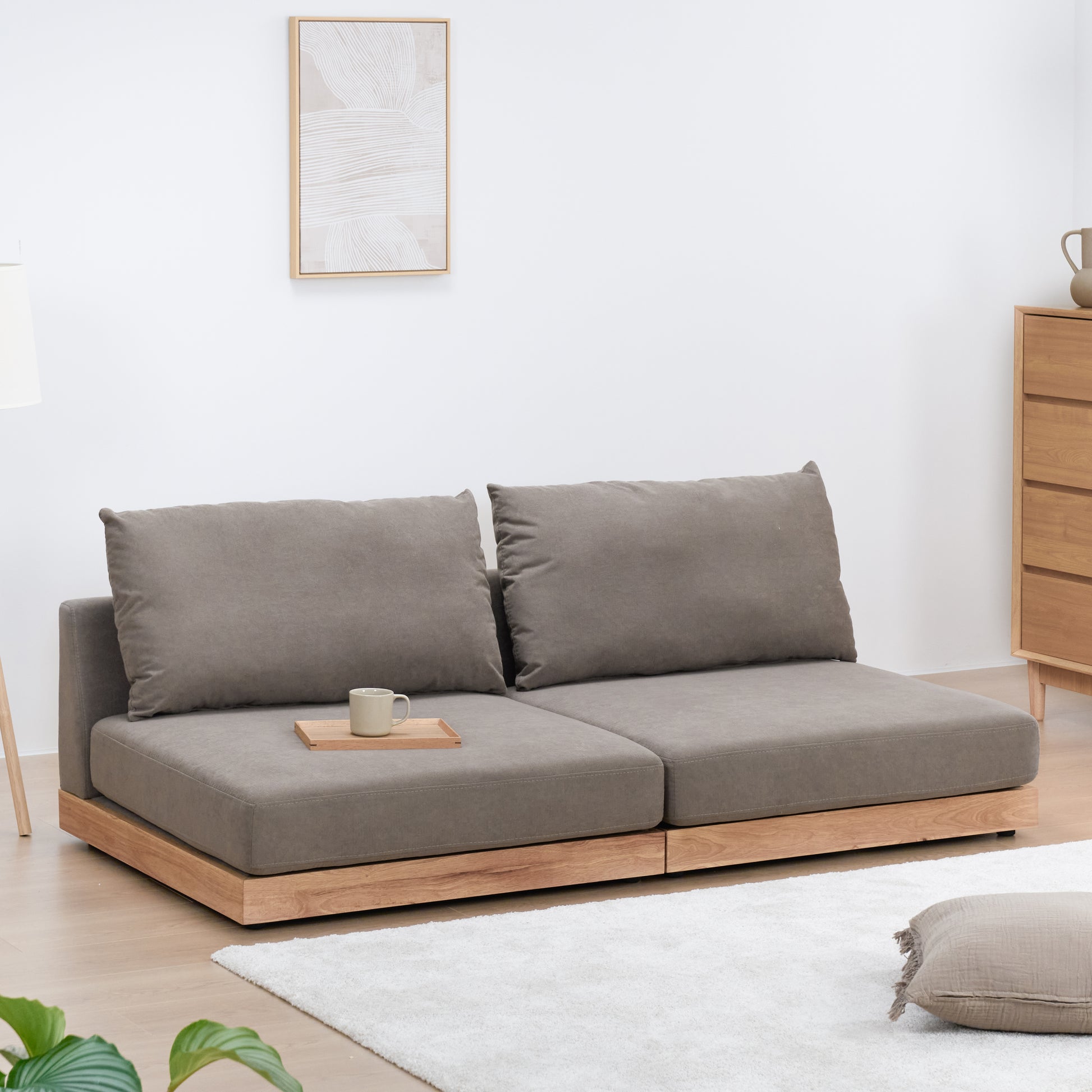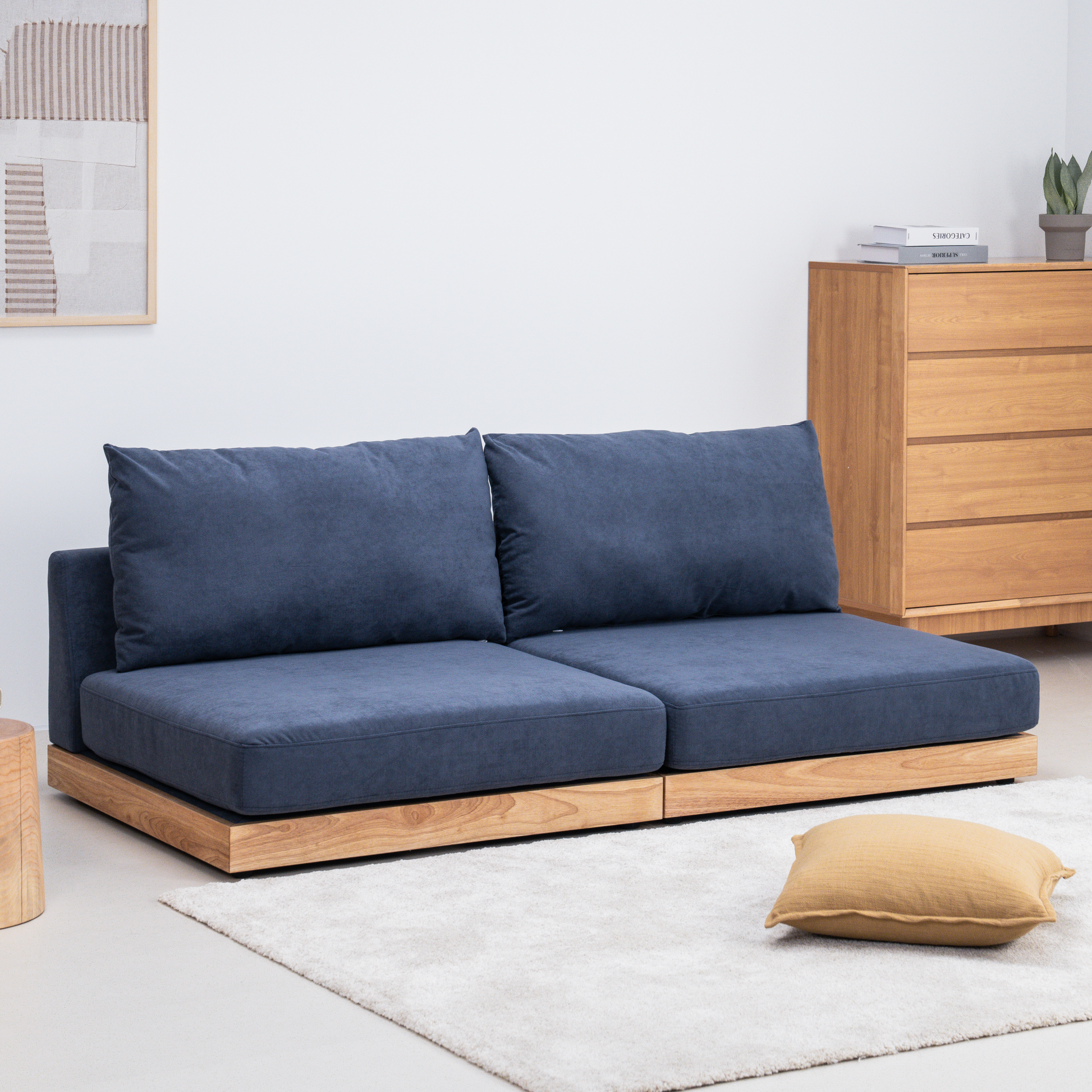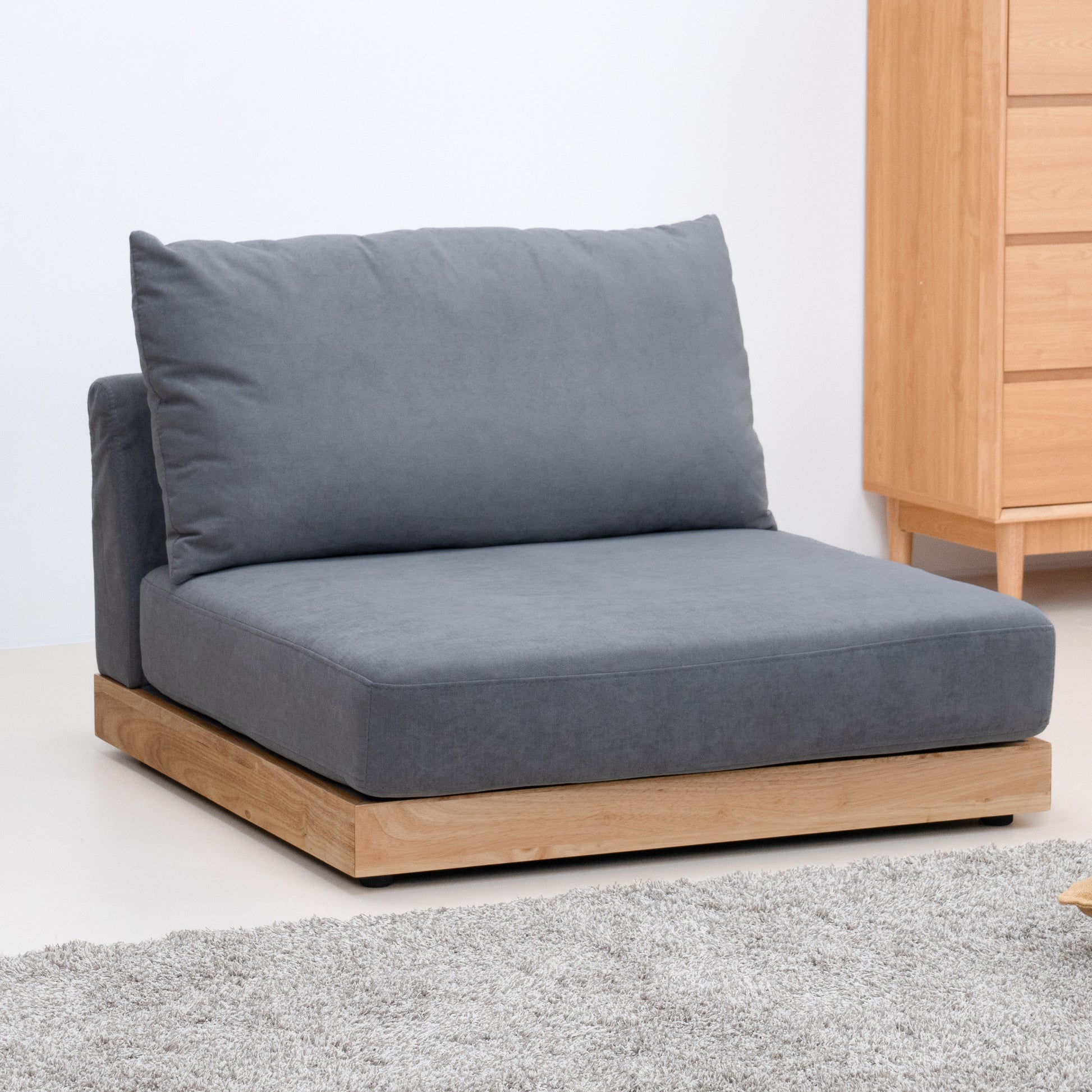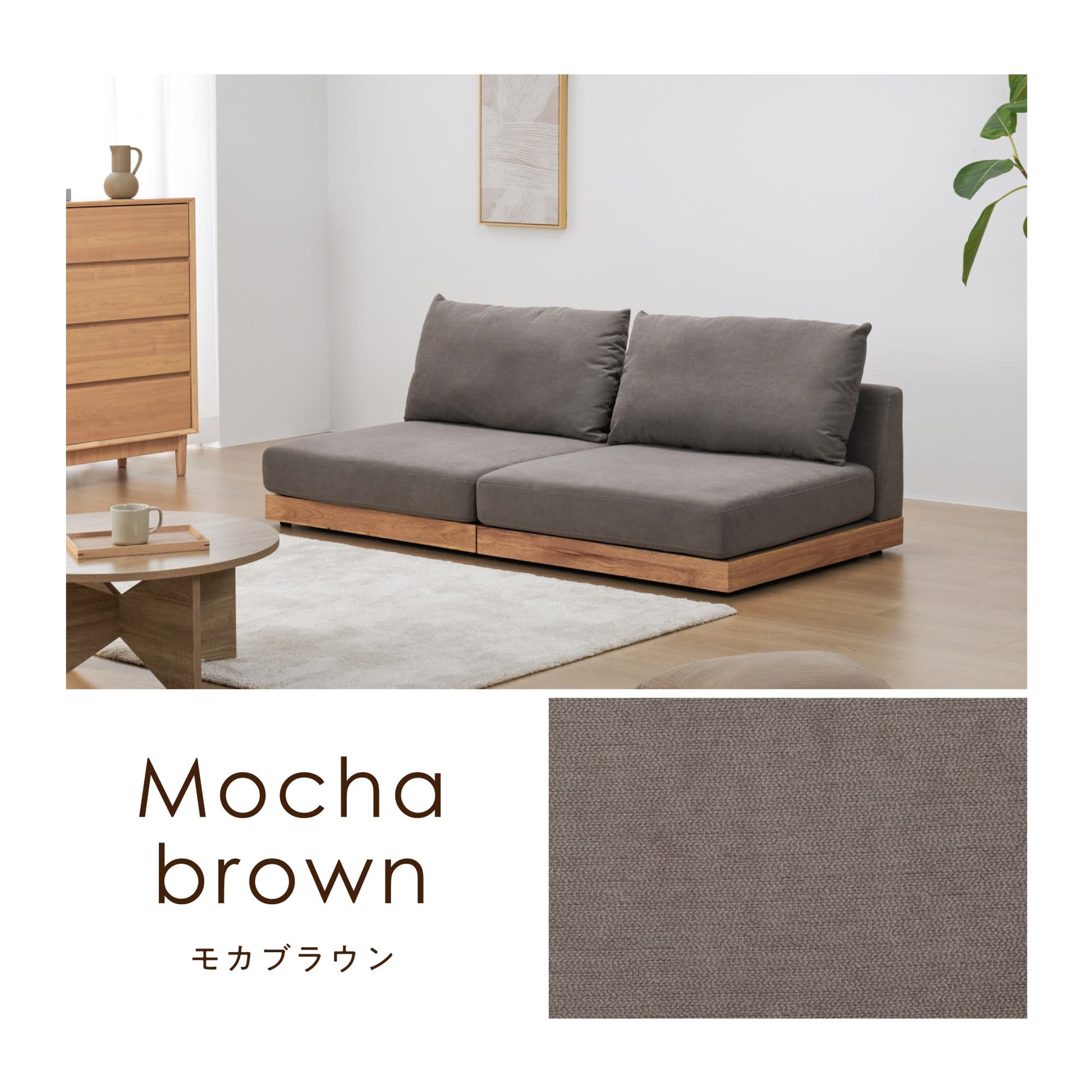 おうち時間をより快適に過ごせるよう、ロータイプのデザインにしました。視覚的にお部屋を広く見せる効果があり、リラックスした雰囲気を演出します。別売りの木脚を取り付けることで、さらに異なるスタイルを楽しむことも可能です。