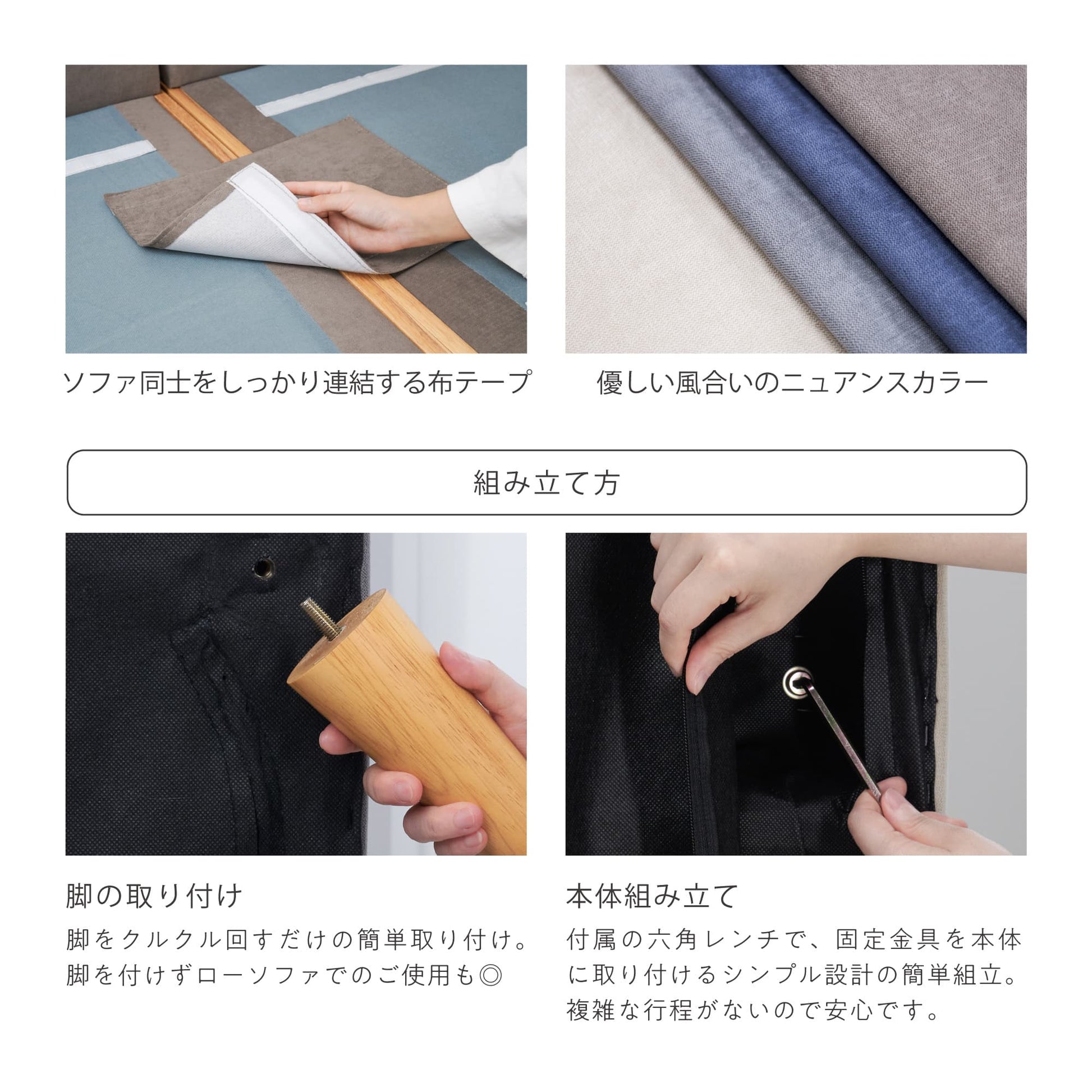 組み立てに必要なパーツ・工具は全てセットになっているので、お客様ご自身での工具の準備は必要ありません。組み立てが簡単にできるよう、背もたれや脚の取り付けをシンプルにしました。初めての方でもスムーズに組み立てられるように工夫しています。届いたその日からすぐに使える便利なソファです。