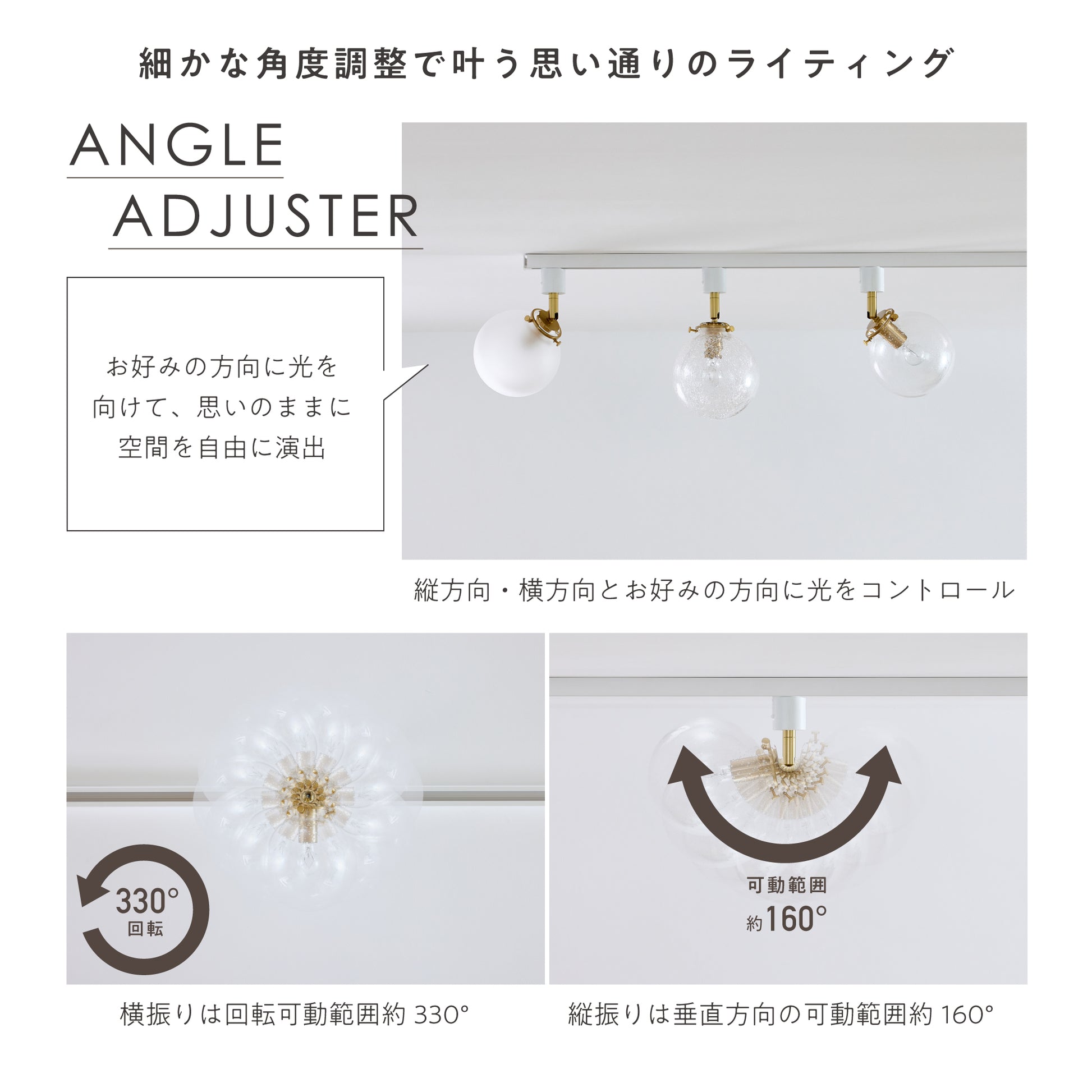 細かな角度調整が可能で、光を自在にコントロールできます。横振りは約330°、縦振りは約160°まで調節可能。お好みの方向に光を向けて、思いのままに空間を演出できます。ガラスシェードの角度を調整する際は、ソケット部分を持って行うと安全です。