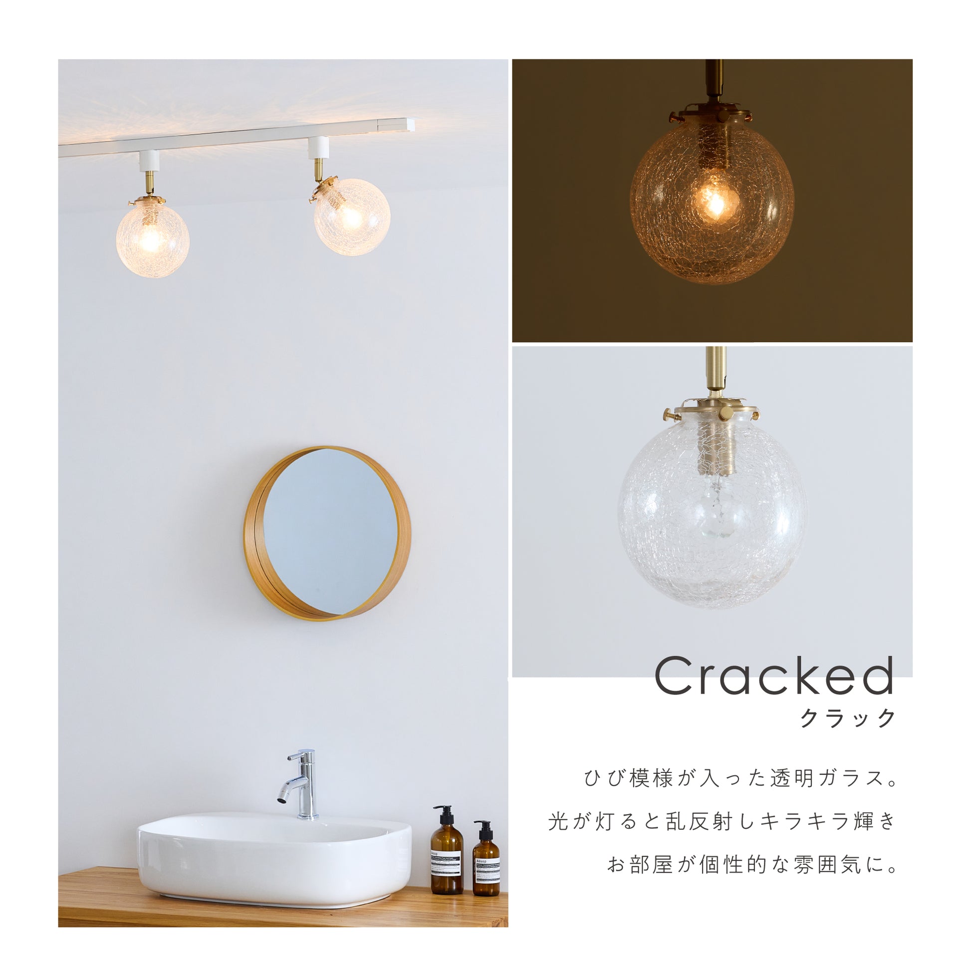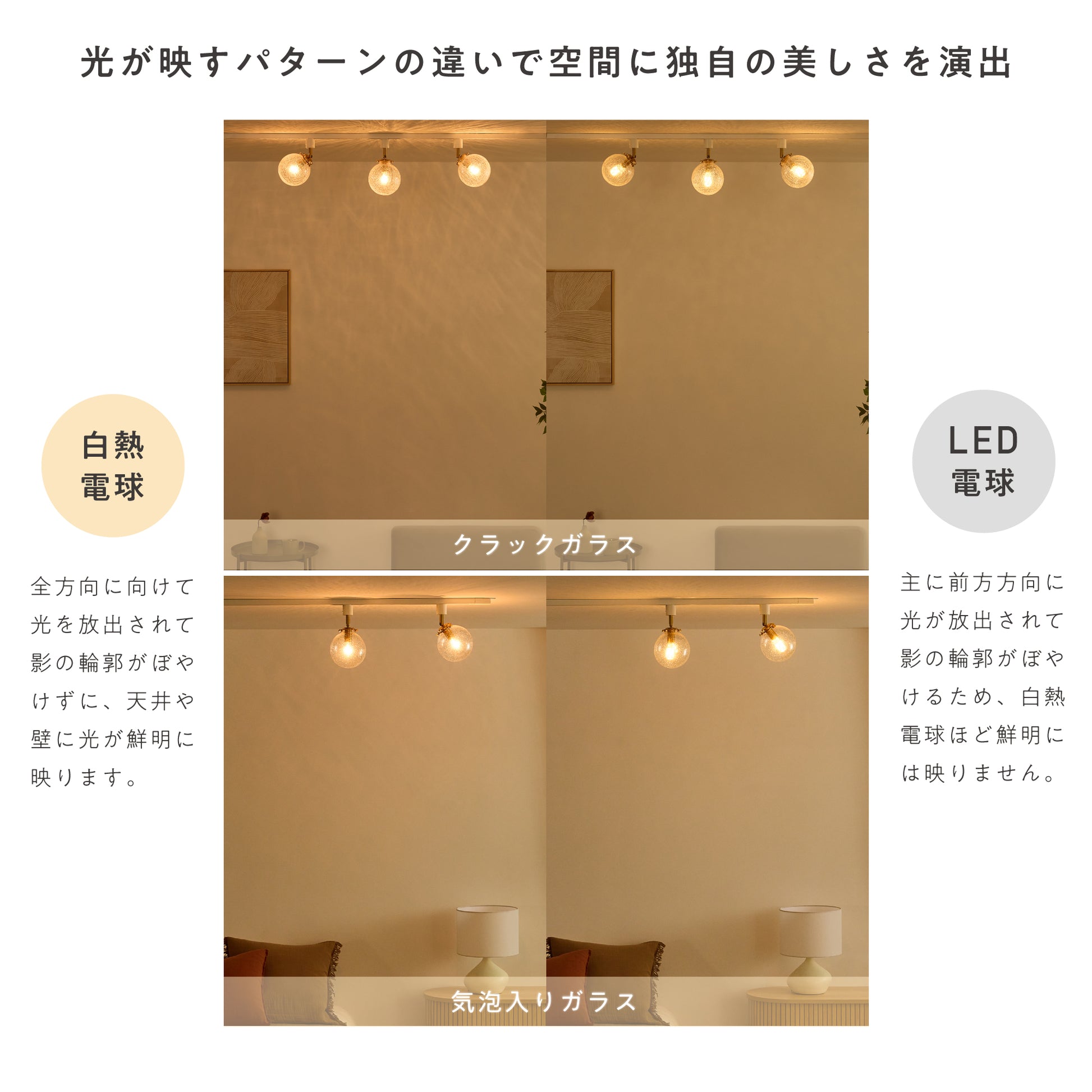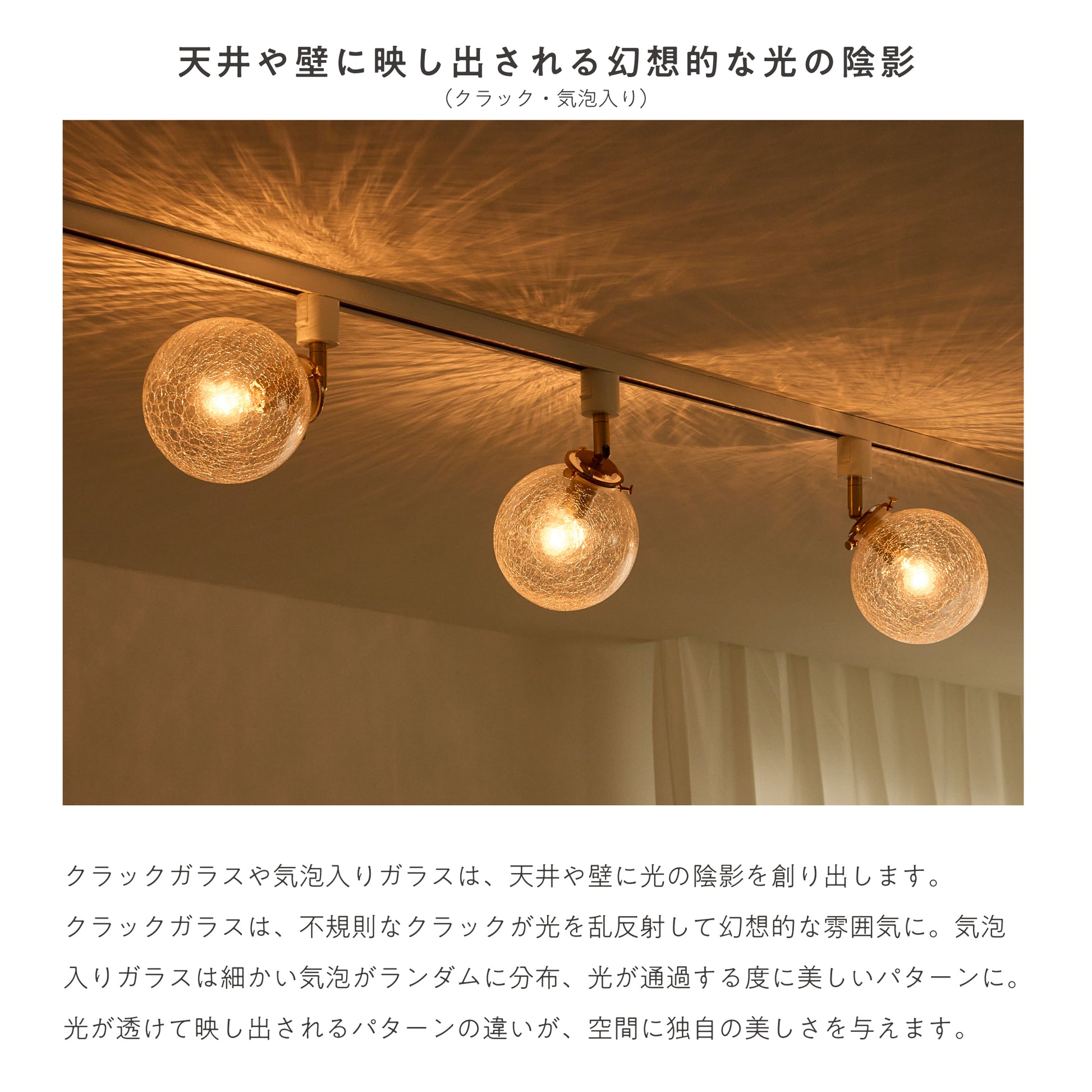 クラックガラスや気泡入りガラスは、天井や壁に映し出される独特の陰影を創り出します。クラックガラスは、不規則なクラックが光を乱反射させ、幻想的な雰囲気を演出。気泡入りガラスは微小な気泡がランダムに分布し、光が通過するたびに美しいパターンを描きます。光が透けて映し出されるパターンの違いが、空間に独自の美しさを添えてくれます。これらのガラスシェードは、白熱電球とLED電球のどちらを使用しても異なる光の表情を楽しめるのも魅力です。