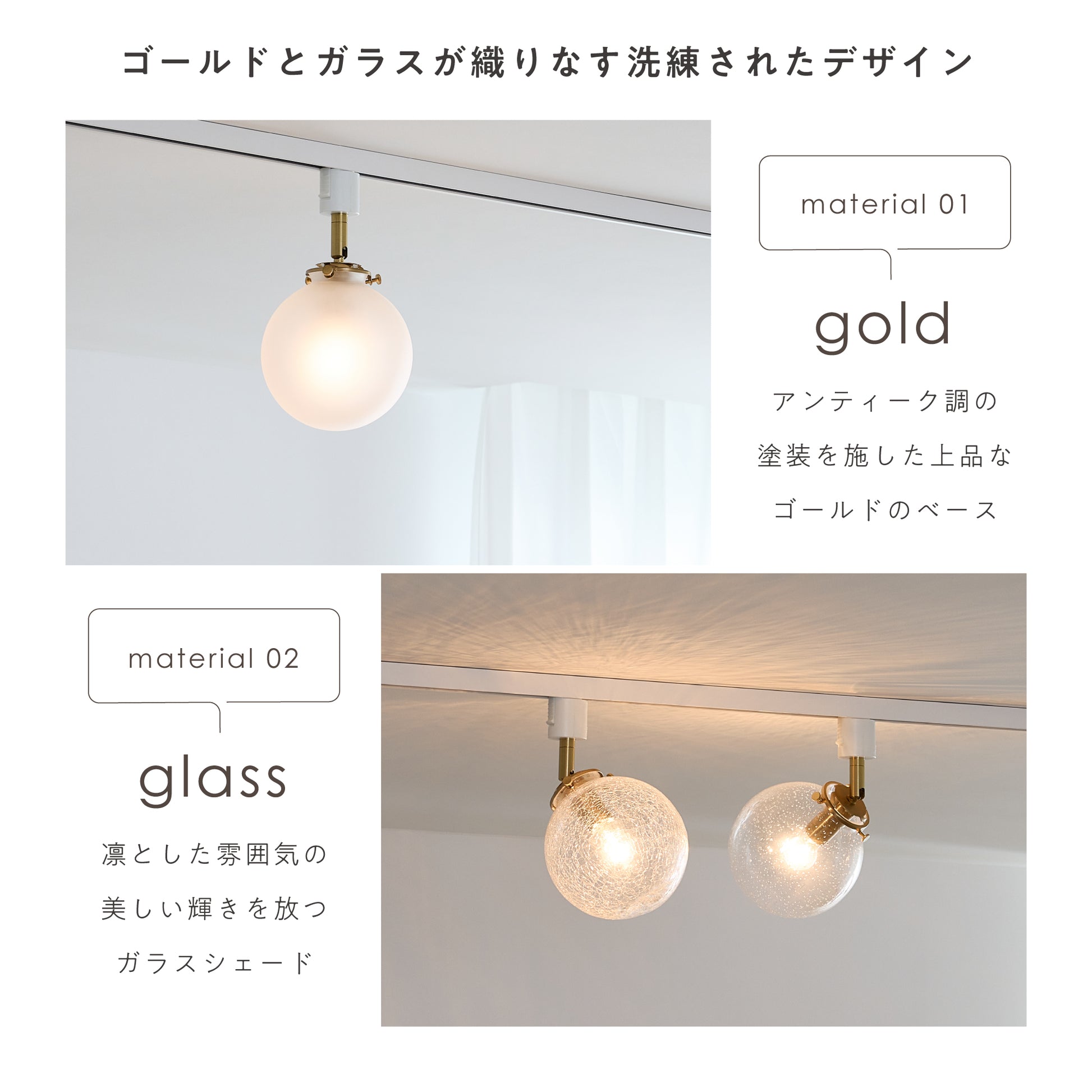 スポットライトMalmo-SPは、デザイン性と特別感を追求しました。ゴールドとガラスが織りなす洗練されたデザインは、空間に上品な雰囲気をもたらします。フロスト、気泡入り、クラックの3つのカラーバリエーションからお選びいただけ、どのタイプも独自の美しさを持っています。フロストガラスは、優しい光が広がり、空間を柔らかく照らします。気泡入りガラスは、透明感が際立ち、軽やかで上品な印象を与えます。クラックガラスは、光がひび割れ模様に乱反射し、キラキラと輝く個性的な雰囲気を演出します。細かな角度調整が可能で、ライティングを自由自在にコントロールできるため、お好みの場所に光をプラスして、表情豊かな空間を演出できます。さらに、シリーズで揃えることで統一感のあるお部屋に。取り付けも簡単で、手軽に特別なひとときを楽しめます。スポットライトMalmo-SPは、デザイン性と機能性を兼ね備えた特別な照明器具として、日々の暮らしに彩りを加えます。