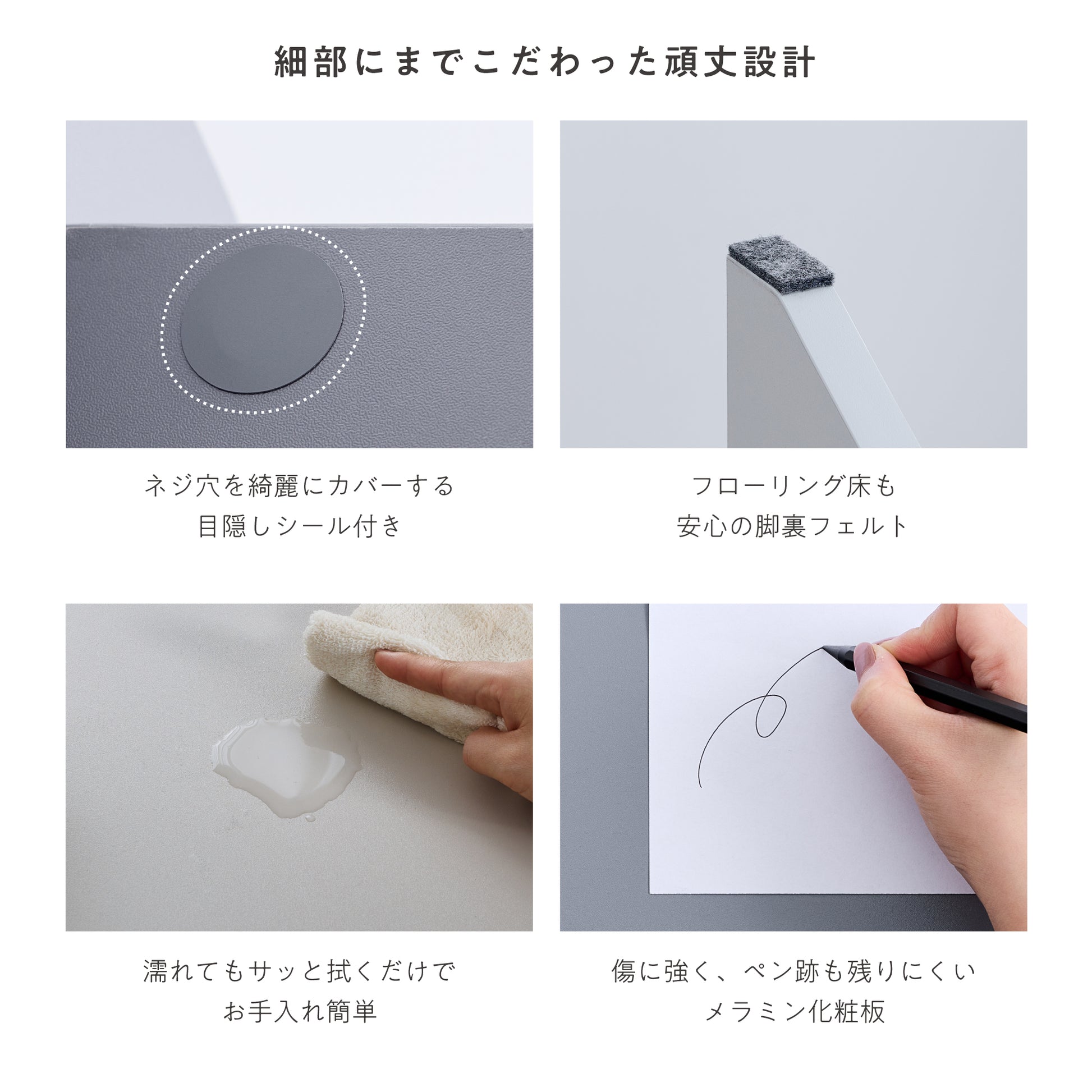 床への傷付きを抑えるフェルト付きの脚で、どんな場所でも安心して使用できます。さらに、ネジ穴を綺麗に隠すカバーシール付きで見た目もすっきり。天板や棚板は水拭きできるので、濡れてもサッと拭くだけでお手入れ簡単です。日常の使いやすさを第一に考え、細部までこだわりを詰め込みました。