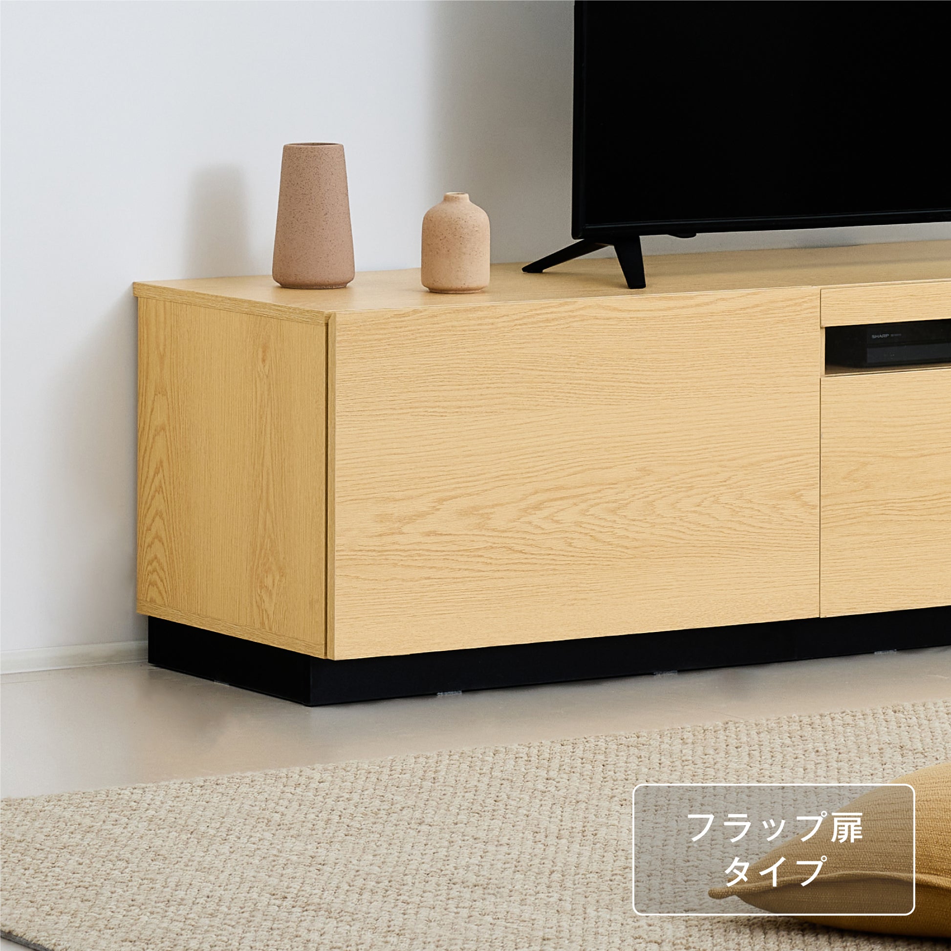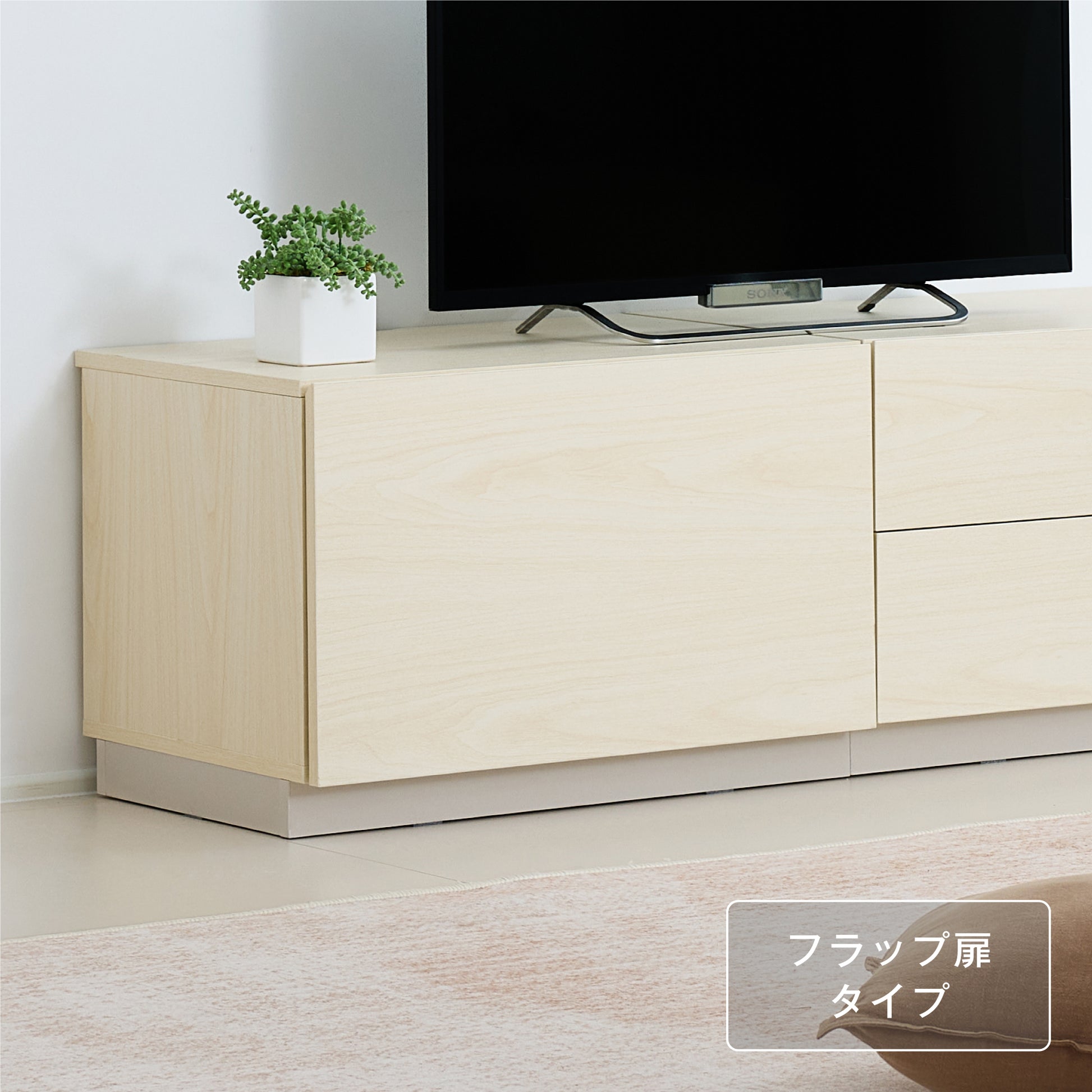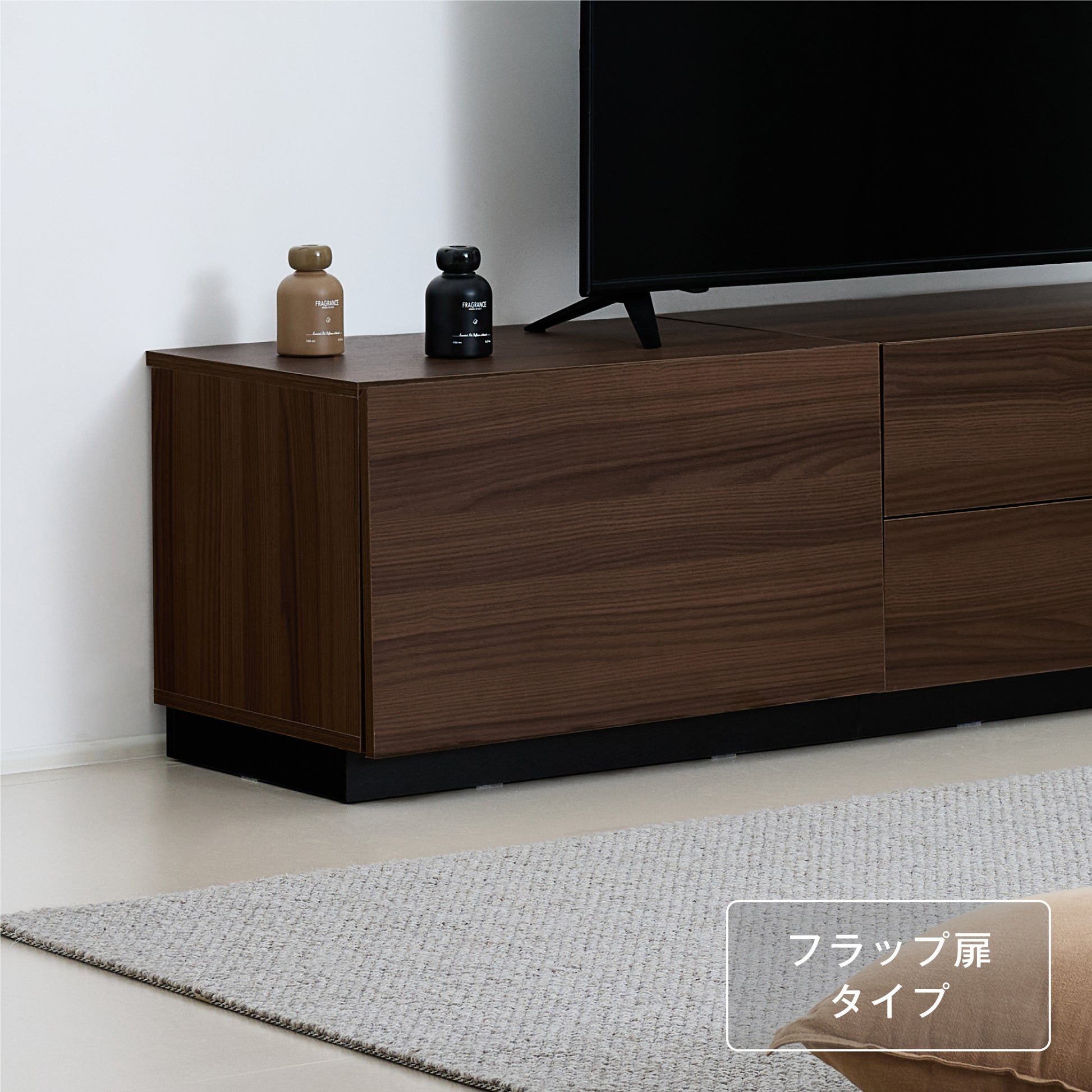 3つの異なる収納タイプを自由に組み合わせ、理想のテレビボードを実現できるよう設計しました。引き出し1段、引き出し2段、フラップ扉の3タイプは、お好みや収納ニーズに応じて自在に配置可能で、組み合わせて使えば幅は最大約180cmまで拡張可能です。単品・セットのどちらでもお選びいただけます。単品でもディスプレイ棚として使えるので、お部屋や使い方に合わせてぴったりのスタイルをお選びください。