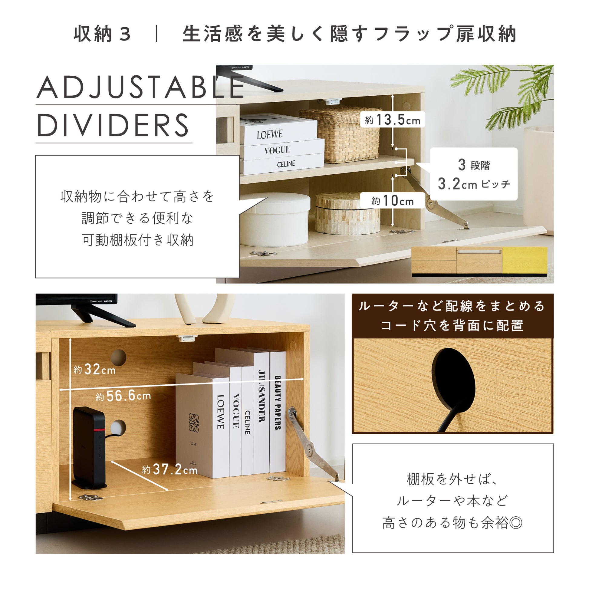 フラップタイプの扉は、美しく隠す収納で生活感をすっきりオフ。ダウンステー仕様で、ソフトかつスムーズな開け閉めが可能です。棚板は可動式で高さ調整ができ、さらに外せば高さのあるアイテムも収納できます。コード穴付きなので配線もまとめやすく、雑多になりがちな生活雑費もしっかり整理整頓。テレビ周りもお部屋もスマートに。