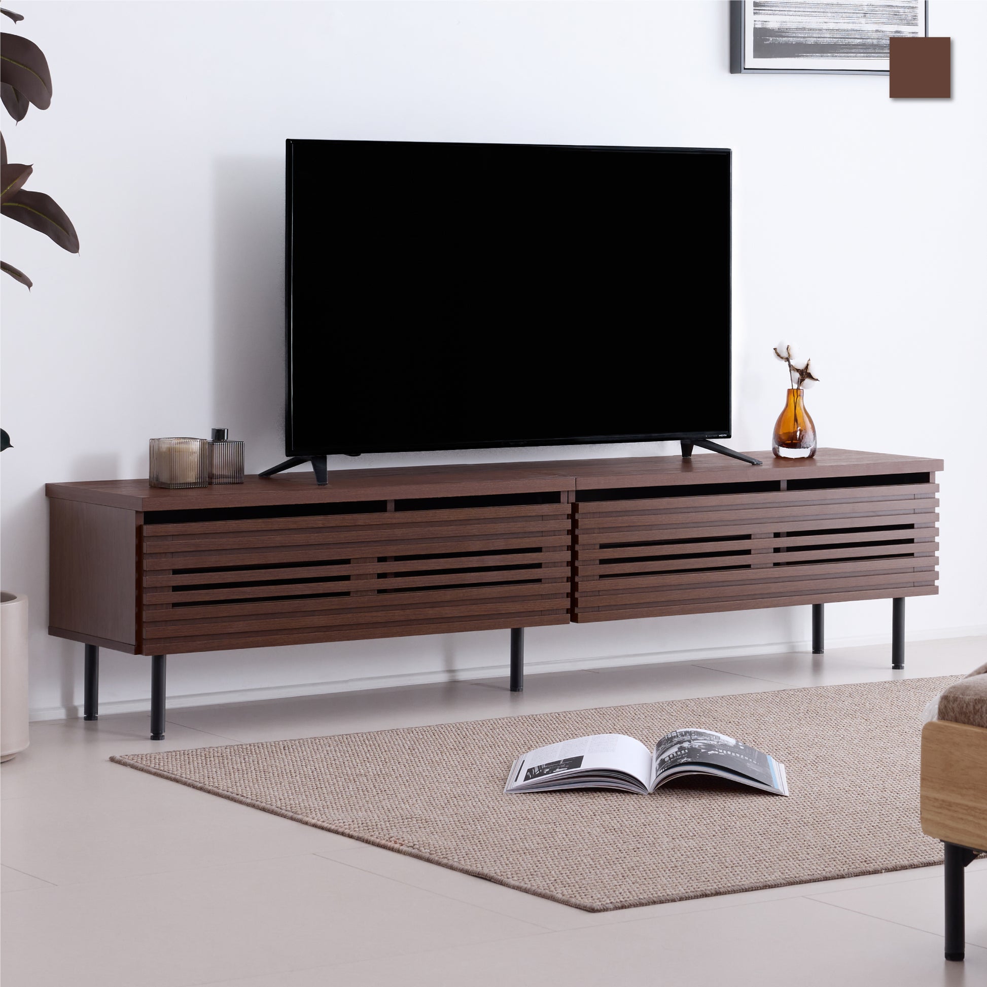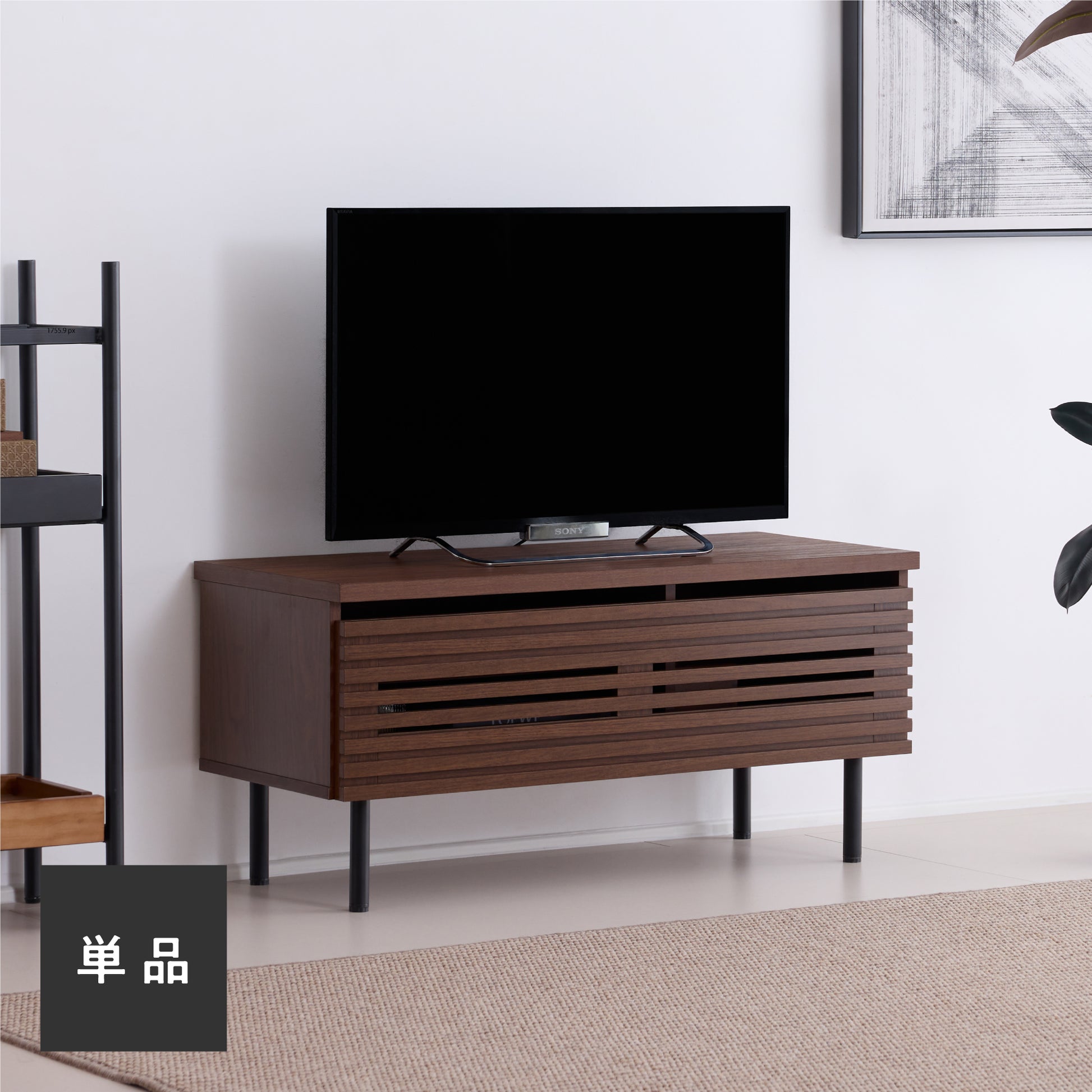 現代のインテリアに調和する、すっきりとしたデザインに仕上げました。ウォールナット調の木目とメタル脚を組み合わせることで、落ち着きのあるモダンな印象に。整然としたシルエットがテレビを美しく引き立て、どんな空間にも自然に溶け込みます。シンプルでバランスの取れたデザインが、空間にさりげない存在感を添えます。