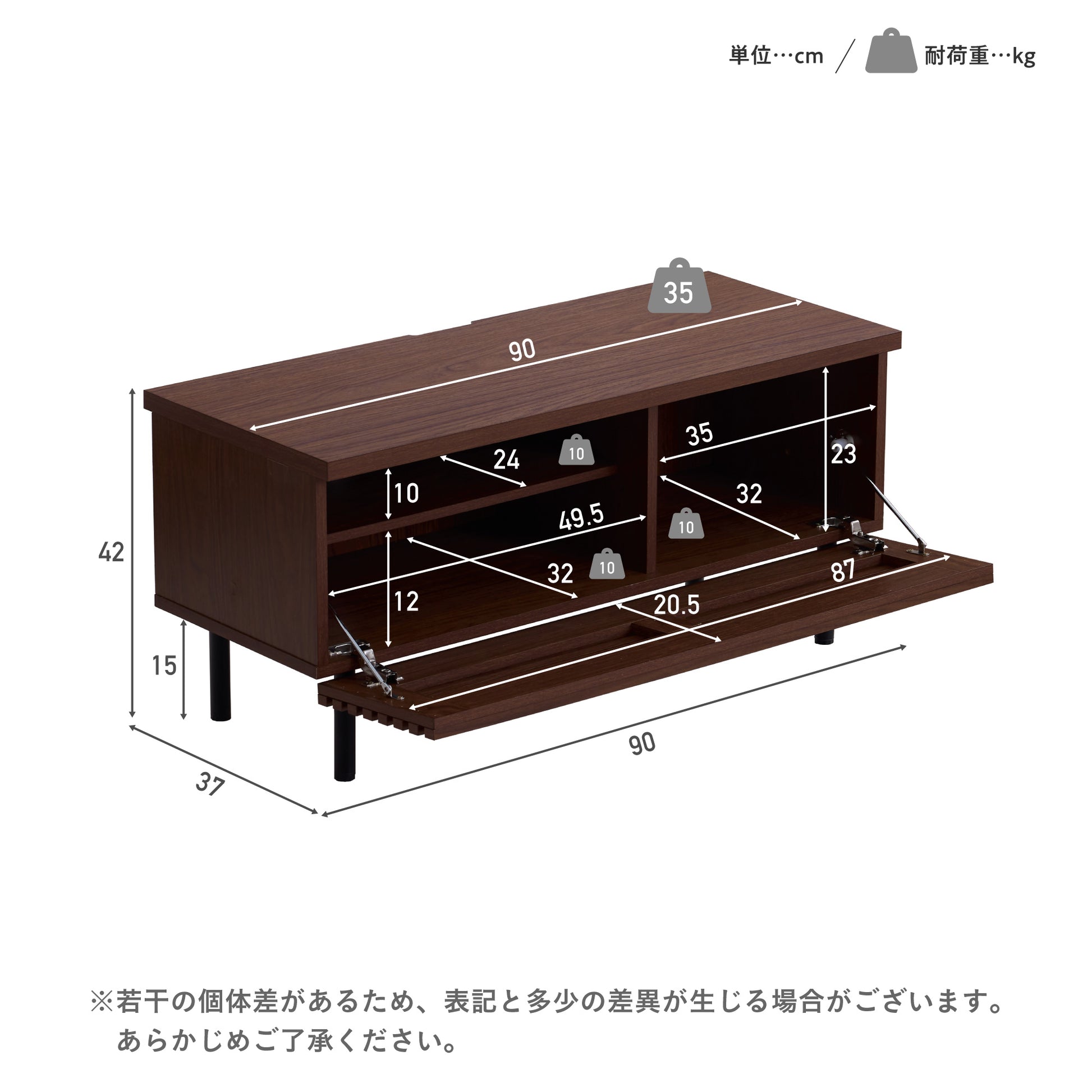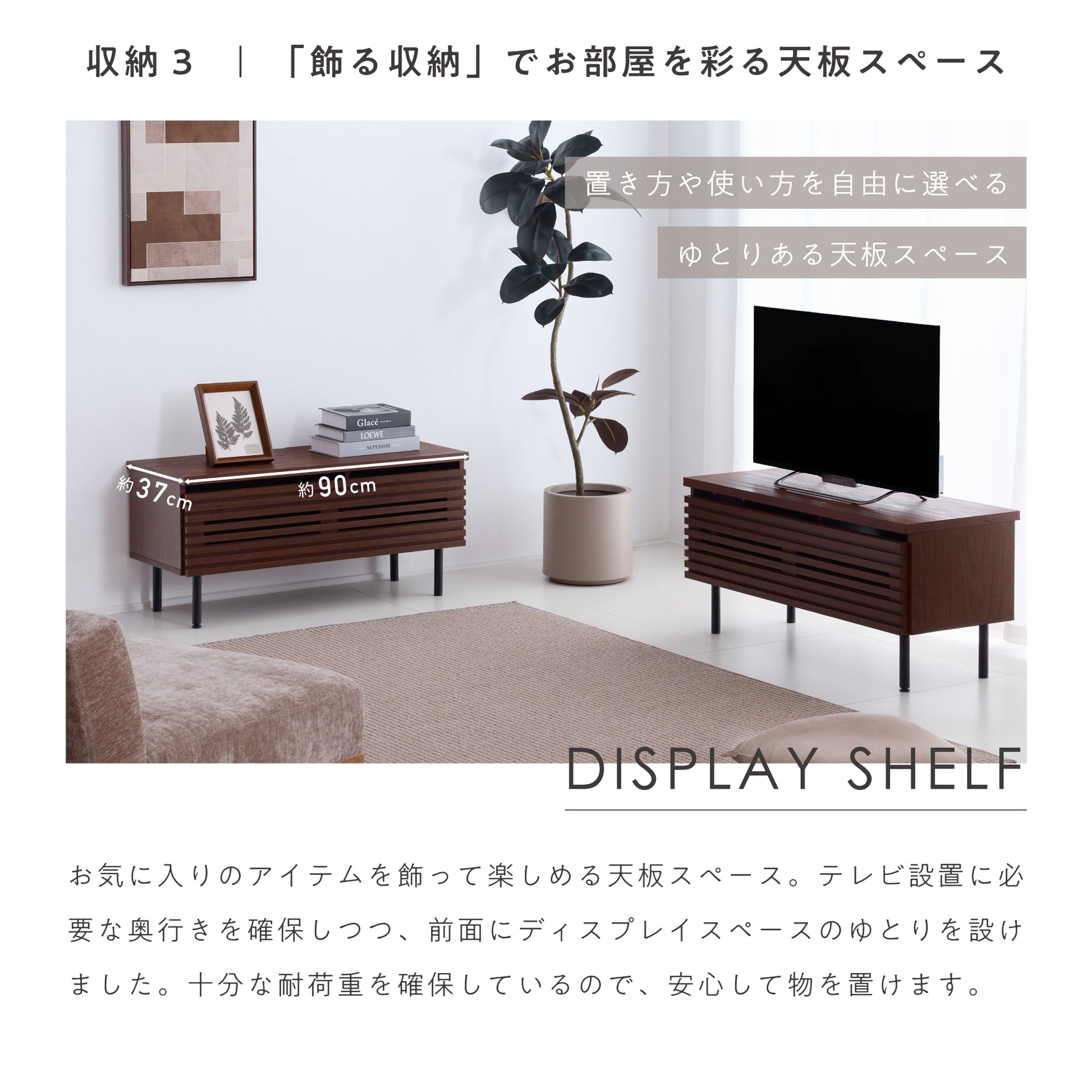 天板は、お気に入りのアイテムを魅せる「飾る収納」としても活用できます。テレビ設置に必要な奥行きを確保しつつ、前面にはディスプレイスペースとして使えるゆとりを設けました。耐荷重は約35kgで、大型テレビはもちろん、インテリア小物やフォトフレーム、観葉植物も安心して置くことができます。