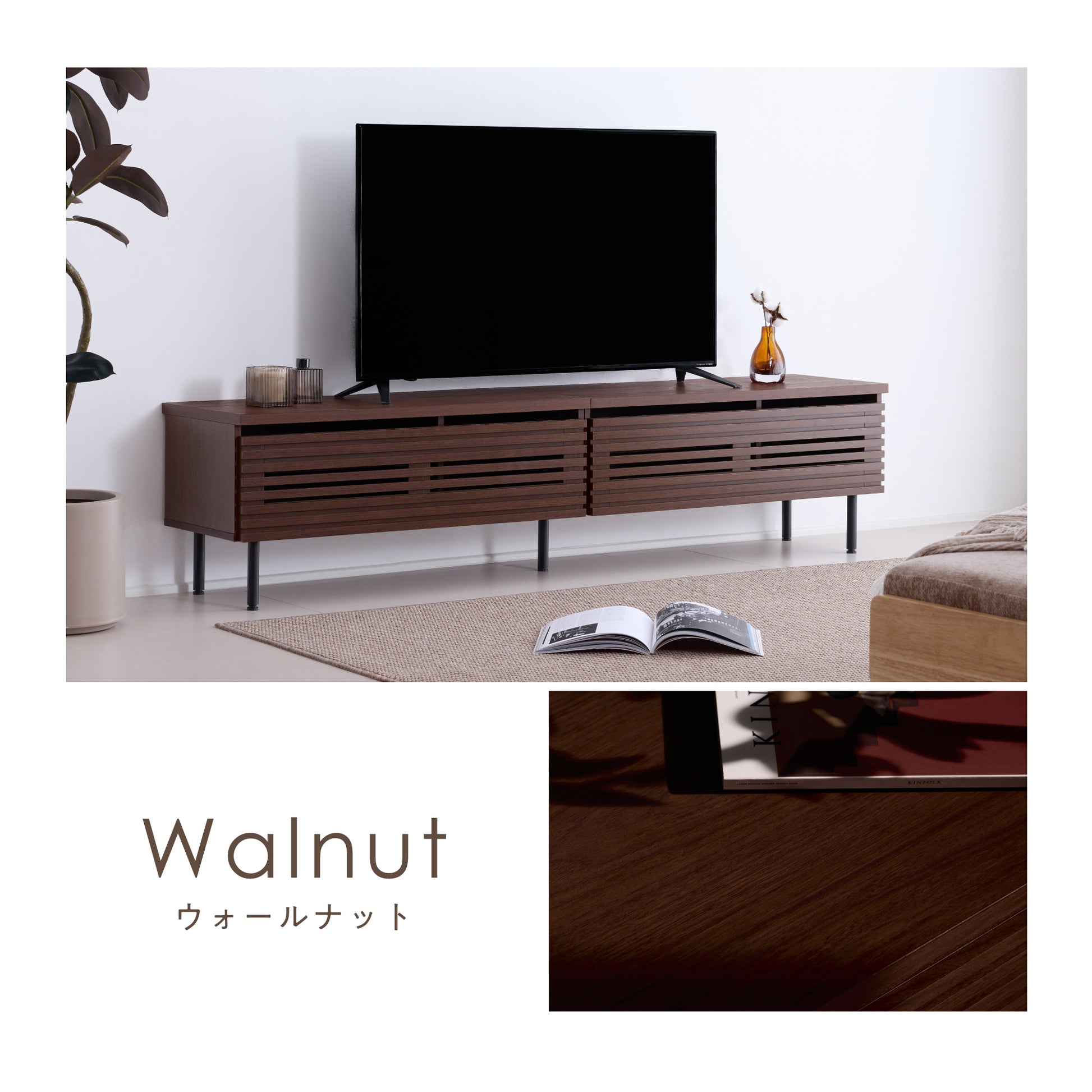 美しさと使いやすさを両立させたいという思いから生まれたテレビボード「Grilia(グリリア)」。整然と並ぶ横格子のデザインがすっきりとした印象を与え、ウォールナット調の木目が空間に落ち着いた雰囲気を添えます。メタル脚を組み合わせることで、落ち着いた現代的な雰囲気に。幅90cmのコンパクトサイズながら収納力にも配慮。扉内の棚板は取り外し可能で、収納物に合わせて調整できます。天板はディスプレイスペースとして使え、背面には配線を整理しやすい設計に。複数台並べて使用すれば、より大きなテレビにも対応し、拡張できる柔軟性も魅力です。