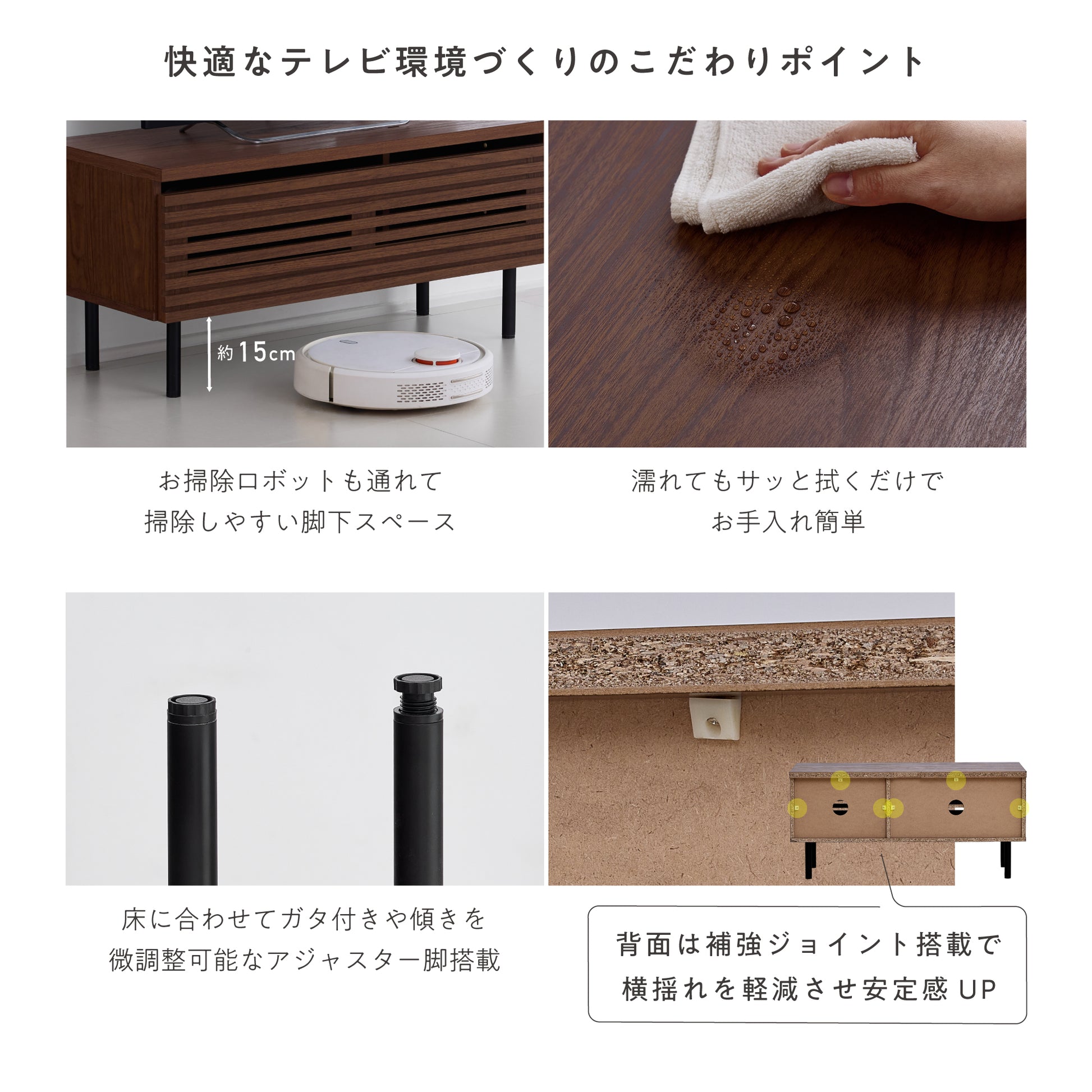 ロボット掃除機も通れる脚下スペースで、床のお掃除もスムーズ。濡れても拭くだけでお手入れできる素材を採用し、日常使いも快適です。さらに、ガタつきを抑える脚裏アジャスターと補強ジョイントを備え、横揺れを軽減。安定感のある設計で安心してお使いいただけます。