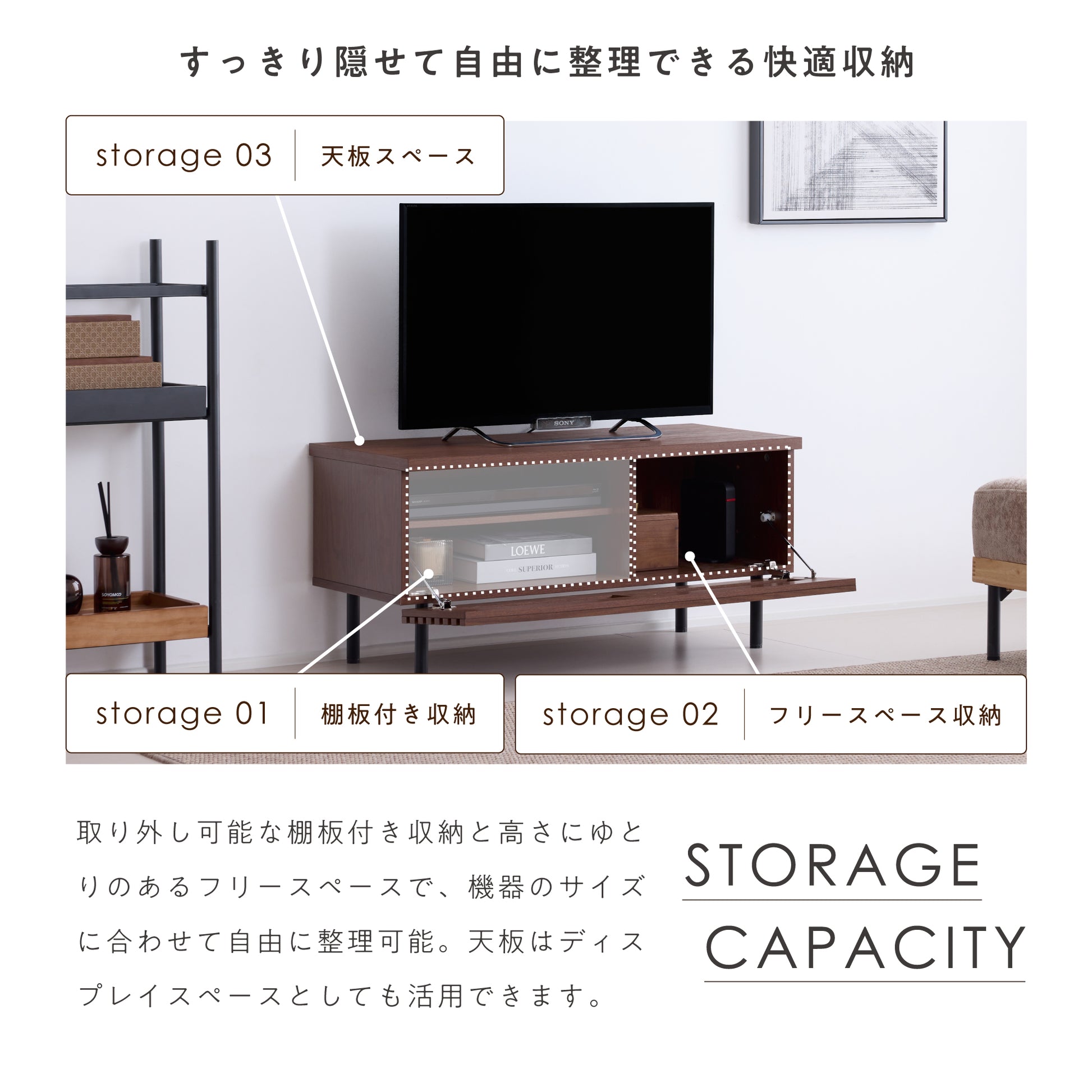 AV機器や周辺機器をすっきりまとめながら、使いやすさにも配慮した収納設計。取り外し可能な棚板付き収納や高さにゆとりのあるフリースペースを備え、機器のサイズや用途に合わせて自由に整理できます。さらに天板はディスプレイスペースとしても活用でき、収納と飾る楽しさを両立。リビングを整った印象に保ちながら、快適なテレビ周りをつくります。