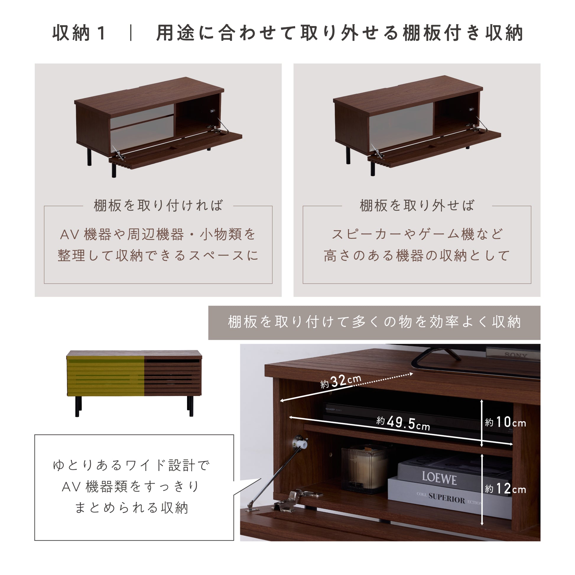 収納する物のサイズや形状に合わせて棚板を取り付け・取り外しでき、収納の自由度を高めます。棚板を外せば背の高いスピーカーや大型ゲーム機も収納でき、棚板を使えばより多くのアイテムを効率よく収納できます。丈夫で扱いやすく、将来的な機器の買い替えやレイアウト変更など、ライフスタイルの変化にも柔軟に対応します。