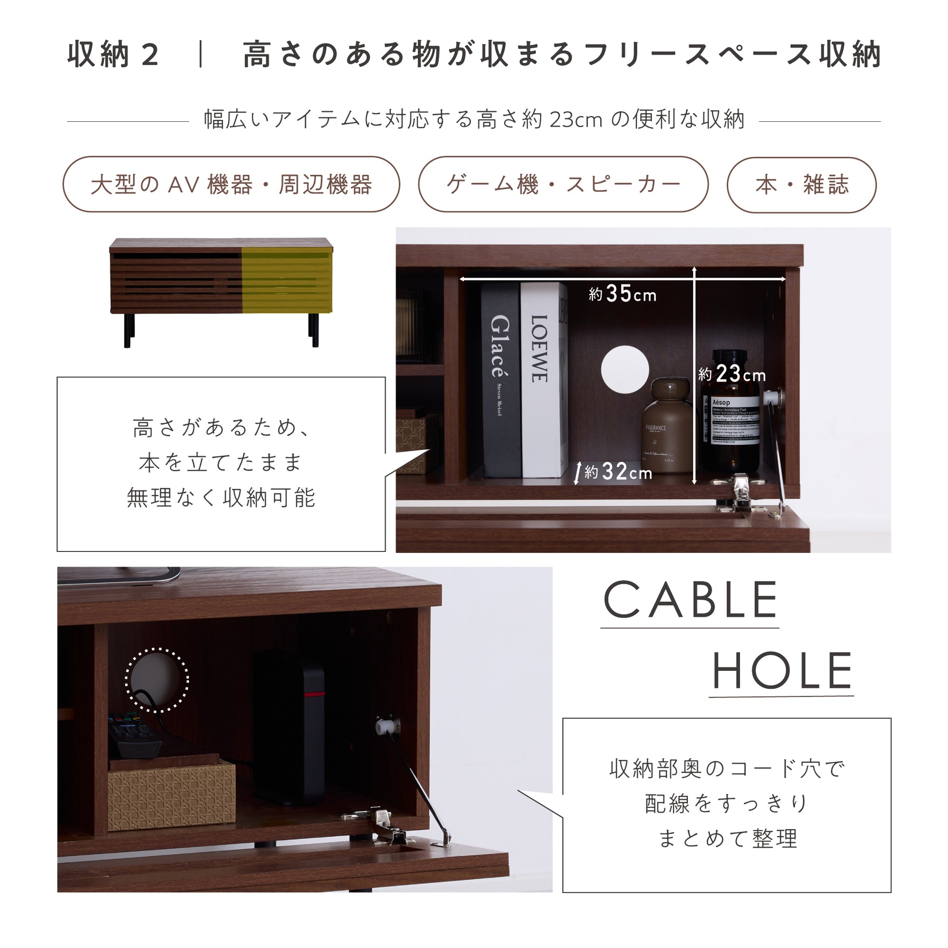 大型のAV機器や周辺機器も収納できるよう、十分な高さと奥行きを確保した収納スペースを設けました。機器本体に加え、接続ケーブルや電源アダプターもまとめて収納でき、ゆとりある設計により機器同士が密着せず熱もこもりにくく安心。各機器が快適に動作できる環境を保ちながら、整理されたすっきりとした収納が可能です。