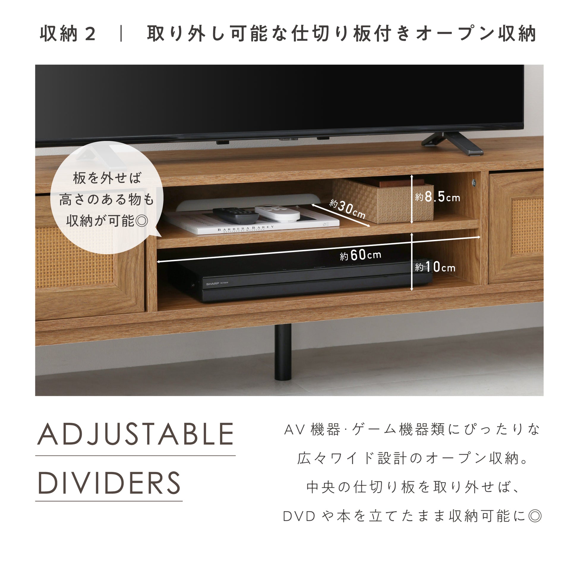 Solix-T180テレビボードは、ラタン調デザインがヴィンテージ感を漂わせる一品です。温もりある素材のコントラストと、細やかなディテールでセンス溢れる空間に。どんなインテリアにも溶け込むサマーオークとヘーゼルオークの2色展開からお選びいただけます。収納面でも優れており、左右の扉収納とオープン収納が生活感を隠しつつ、抜群の使いやすさを提供。耐荷重約40kgの頑丈なつくりで、コードの配線も綺麗に収納できる設計です。、補強脚や傷防止フェルト付きの脚が安定感を高め、掃除のしやすさも考慮した細部までこだわった設計で、テレビ周りを快適にしてくれます。